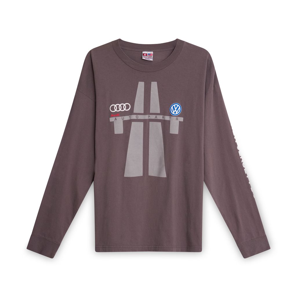 Vintage Audi x Volkswagen Auto Parts Long Sleeve Shirt features design on front, text on sleeve, 100% cotton.