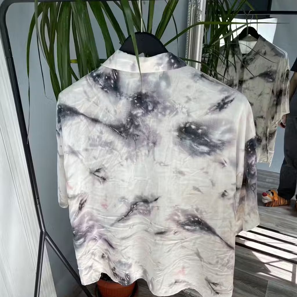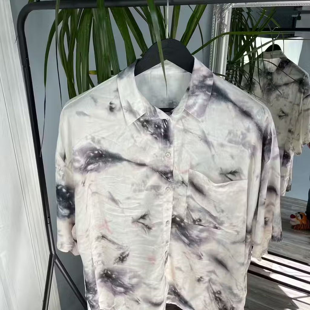 Vintage Avant Garde Shirt features front button closure, chest patch pocket, and tie dye pattern.