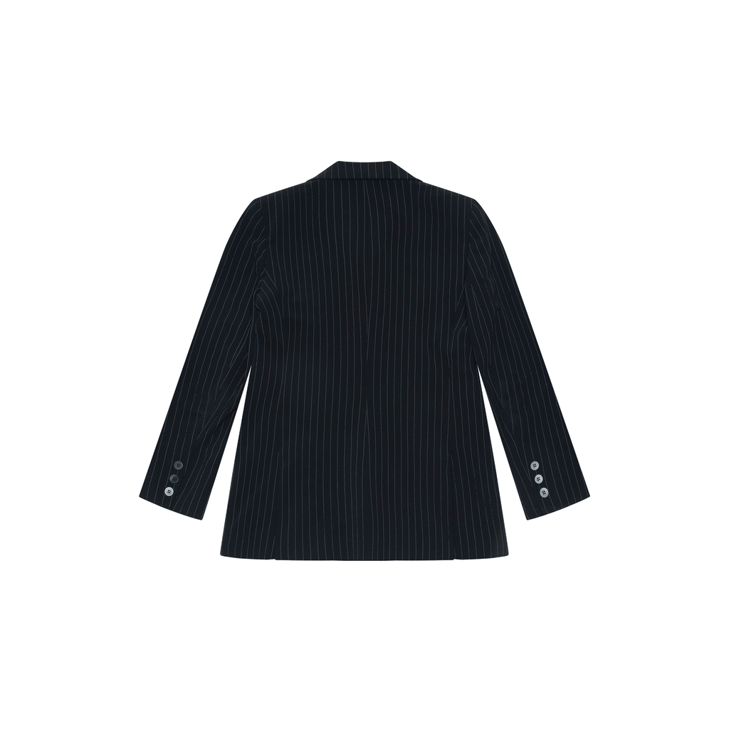 Vintage BCBG Black Pinstripe Blazer features shoulder pads, front button closure, 2 pockets, and pinstripe pattern.