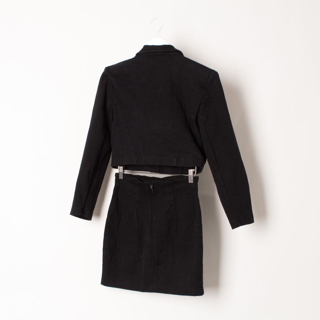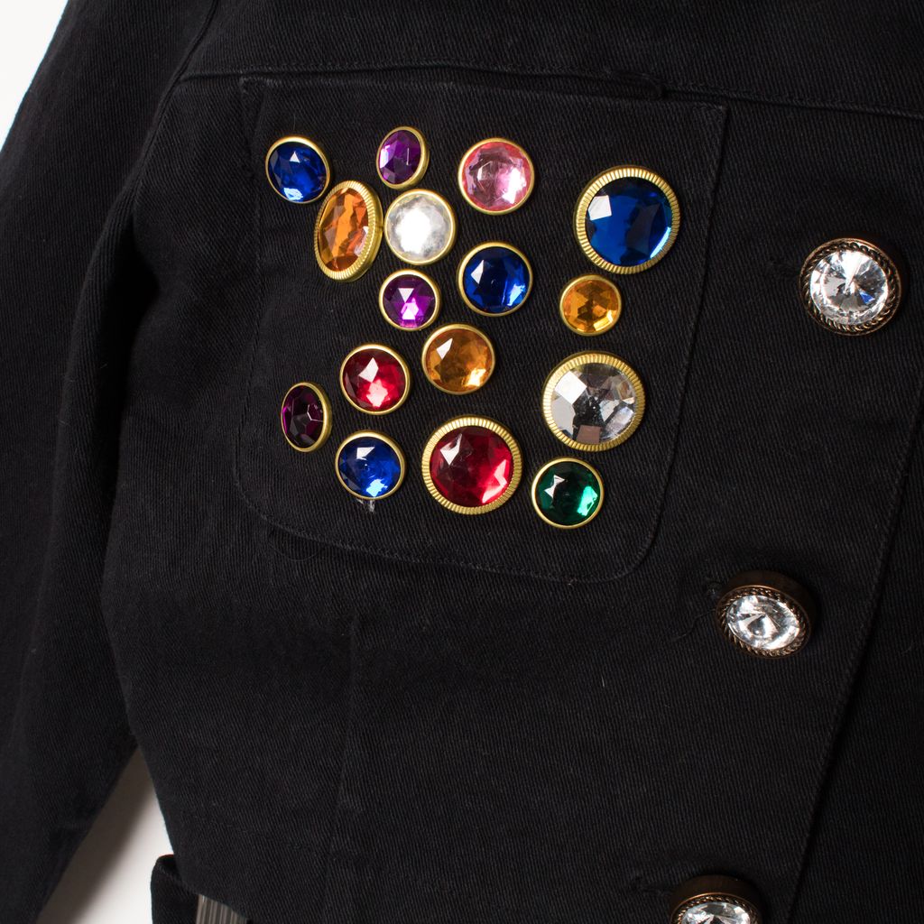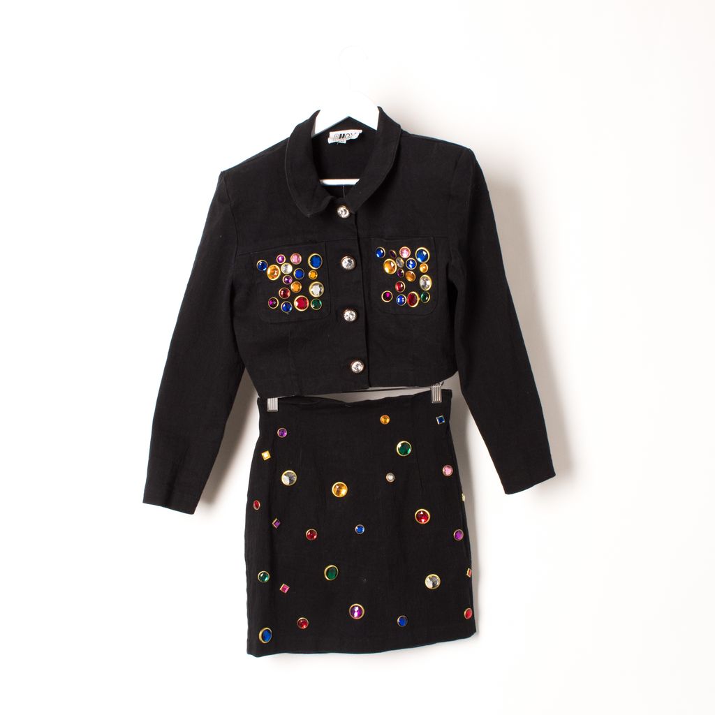 Vintage Bejeweled Cropped Jacket and Skirt Set by Shox clothing. 98% cotton, featuring sewn jewel accent design. Sizing is as follows, the jacket is a M while the skirt is an 11.