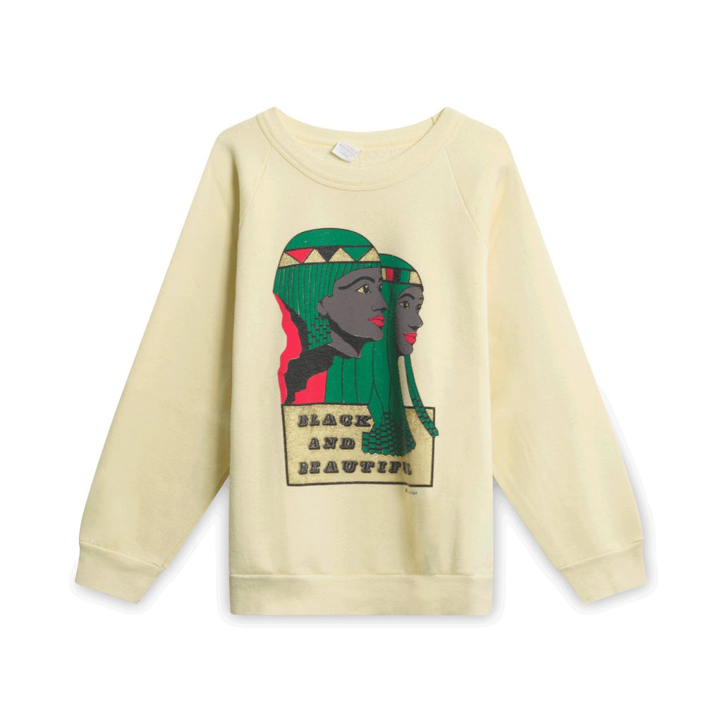 Light yellow sweatshirt with the text "black and beautiful " located underneath a graphic of figures in traditional wear. Text is surrounded by glitter.
