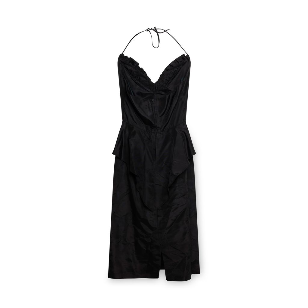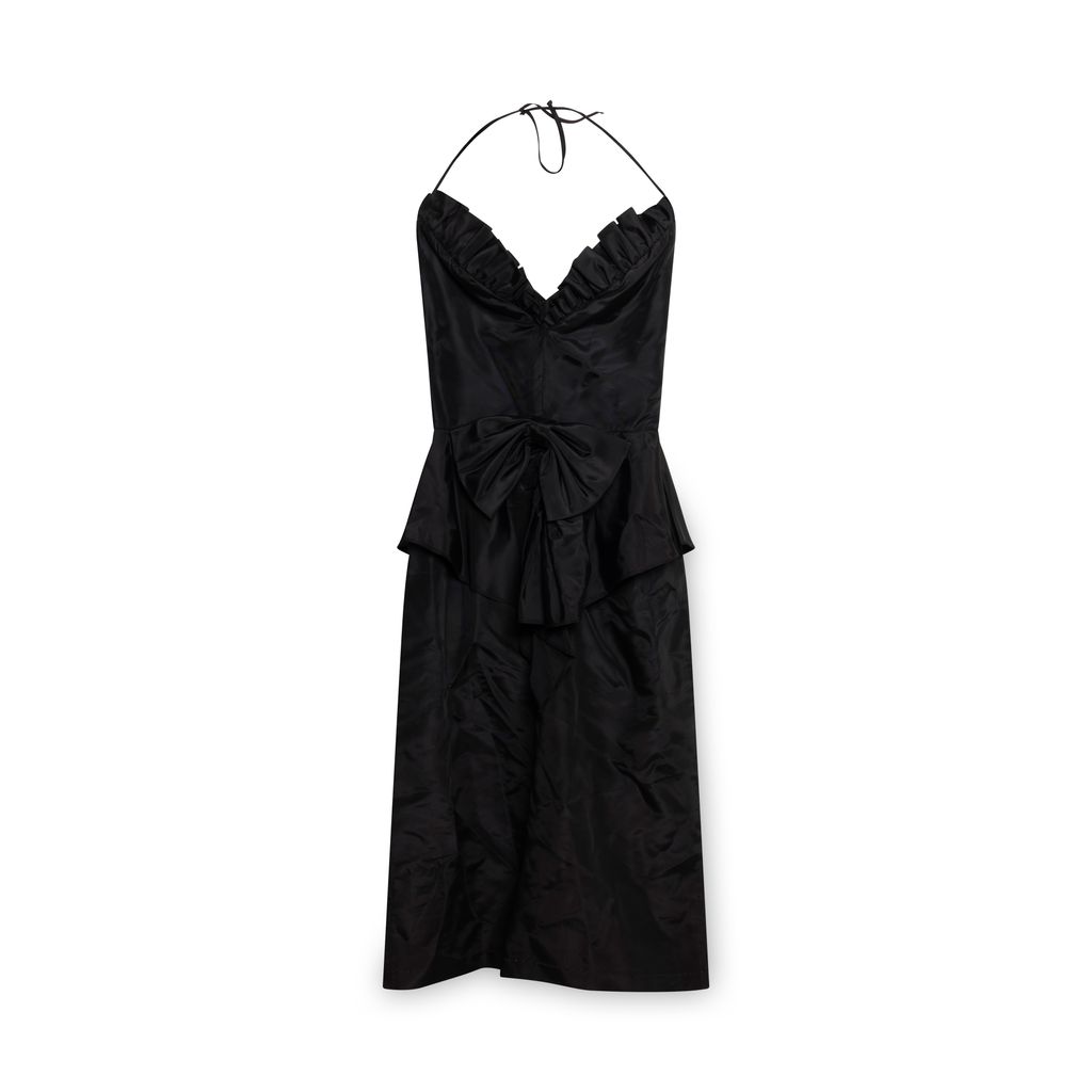 Vintage Black Cocktail Dress features back zipper, halter neck tie, ruffles around neckline, and bow detailing in front.