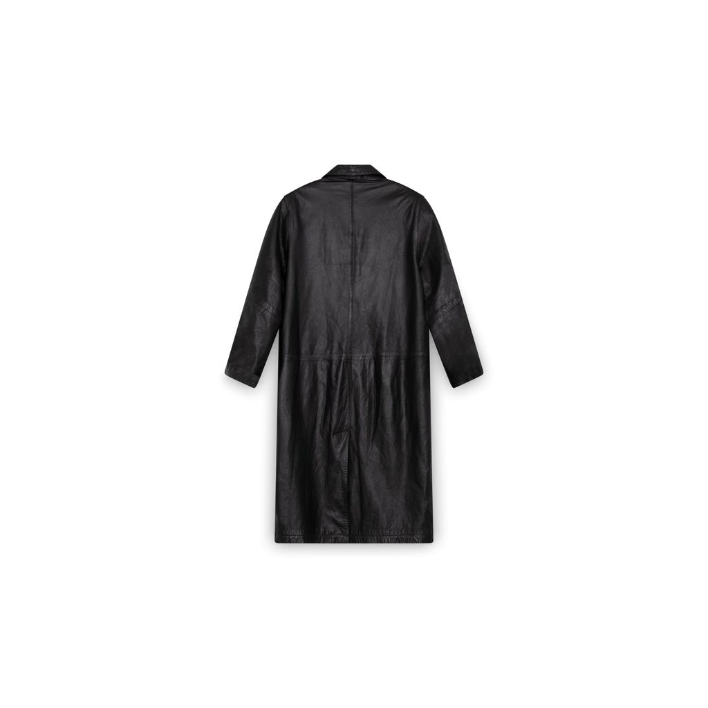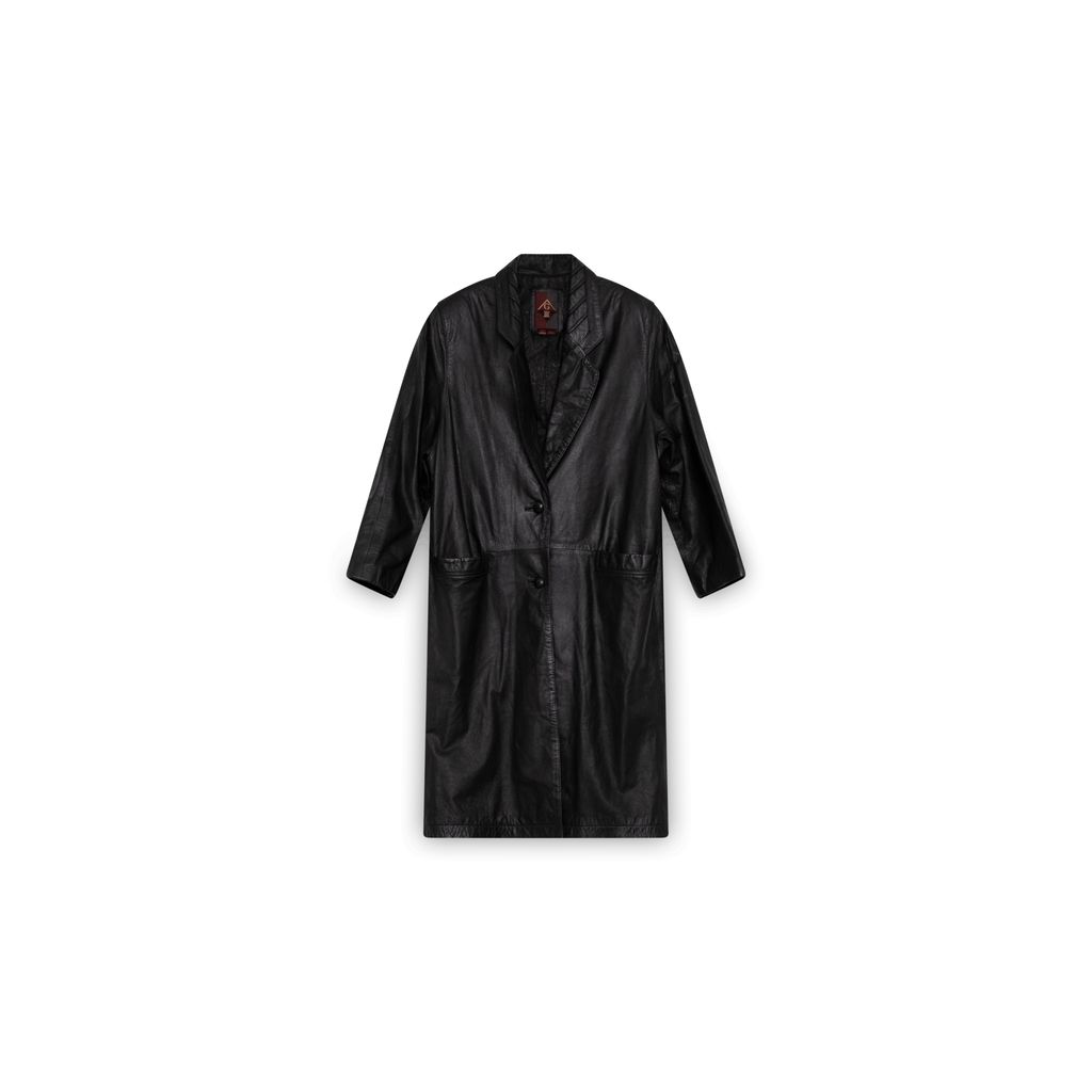 Vintage Black Leather Duster Trench features genuine leather body, layering details at collar, printed lining, and 2 side pockets