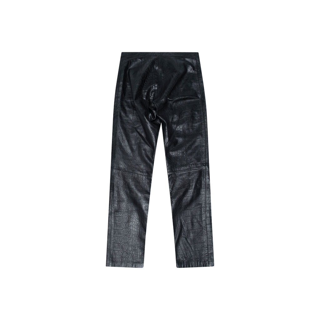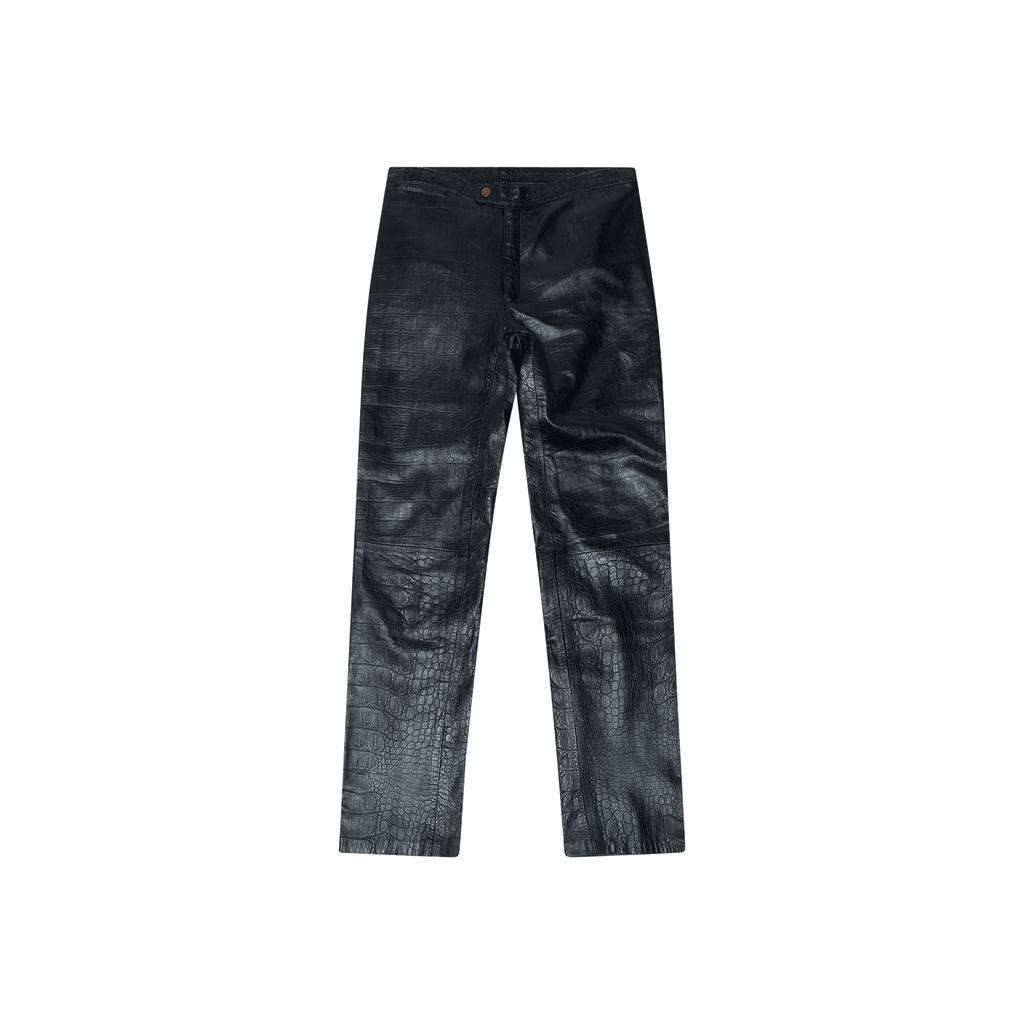 Vintage Black Leather Pants features high waist, faux croc print leather, front zip closure with snap button, and small coin pocket.