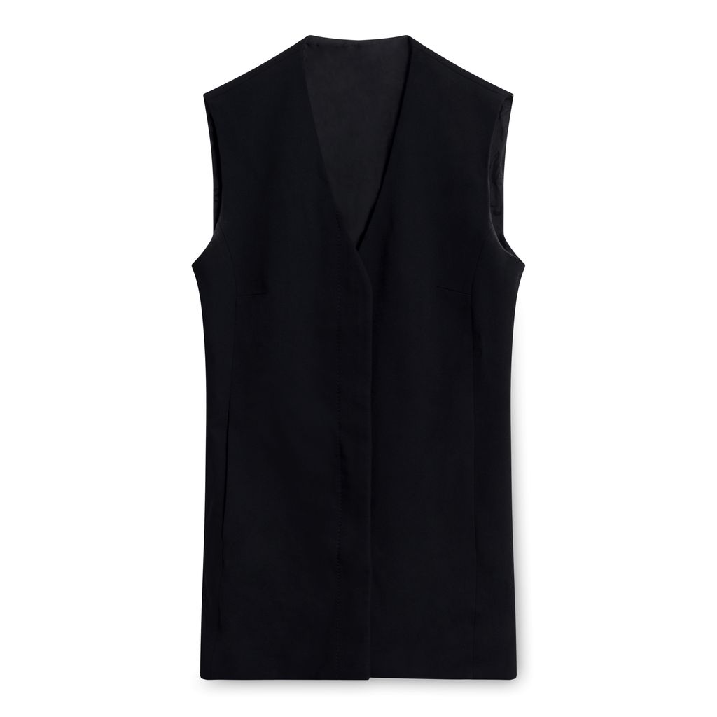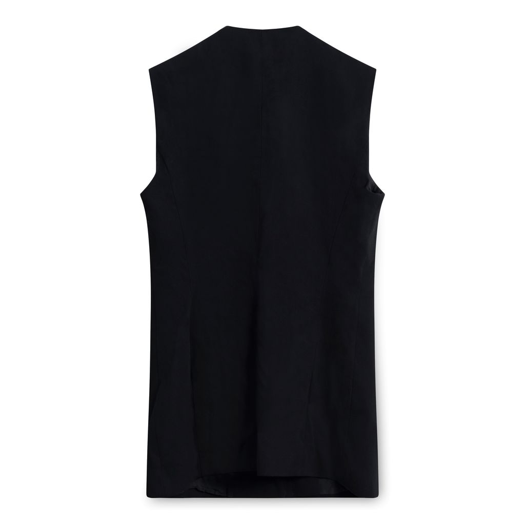 Black sleeveless mini dress with v-neckline and hidden button enclosures going from the chest to the bottom of the dress. A natural, middle slit is located at the center of the dress. Interior features a smooth inner lining, and two hidden pockets line the waist.