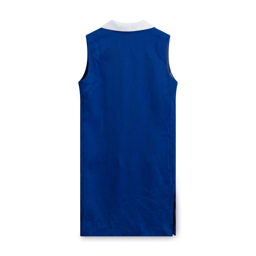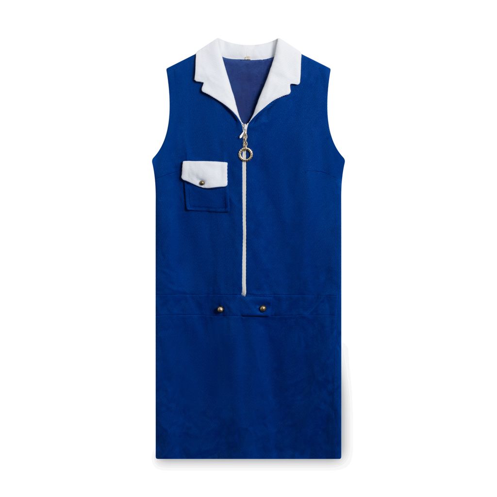 Vintage Blue Tennis Dress features white collar, white and blue left pocket, gold buttons, silver chain, and ribbing.