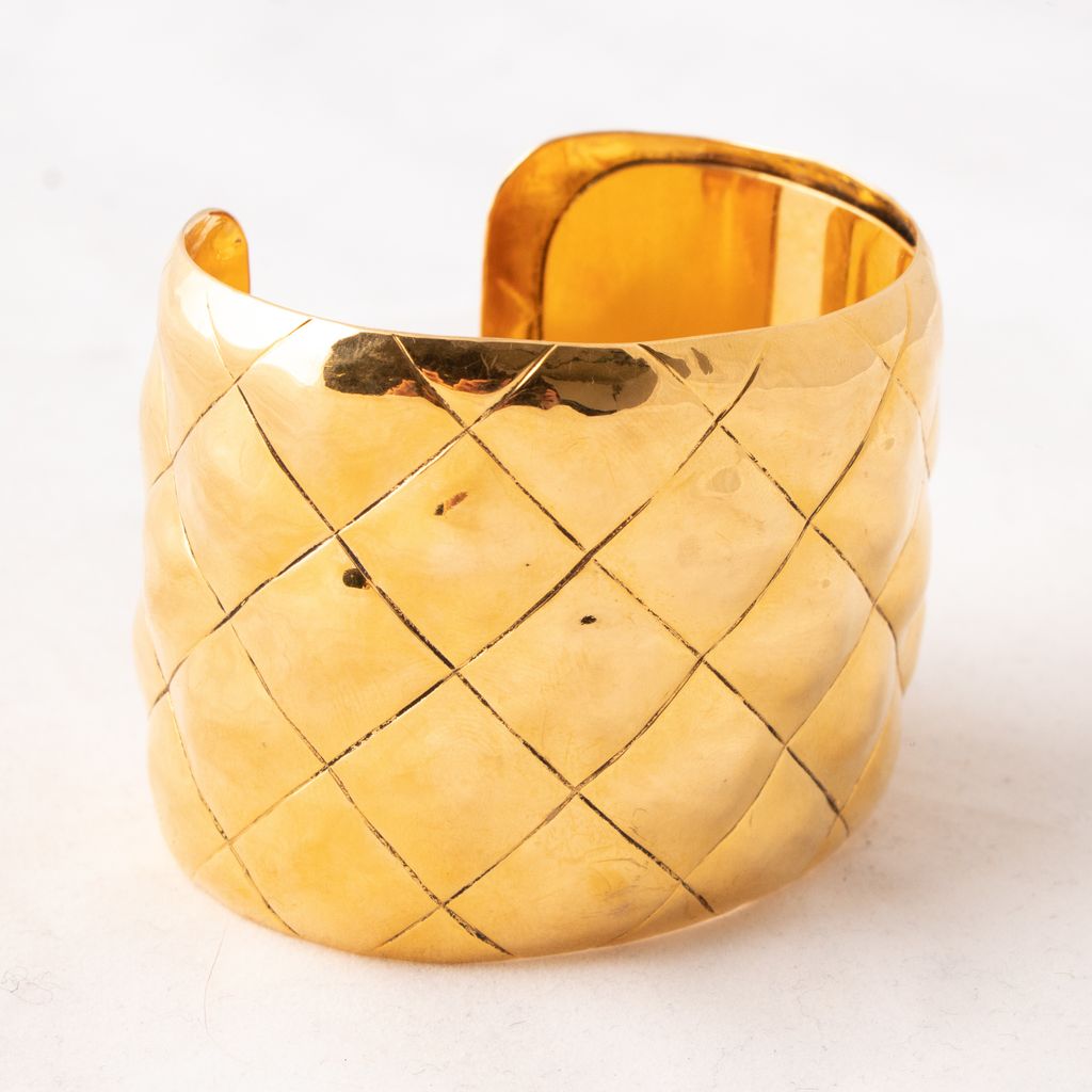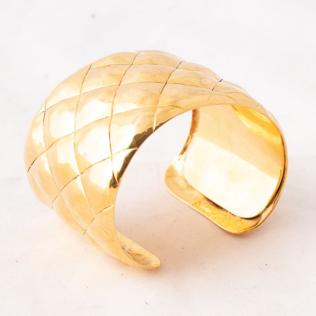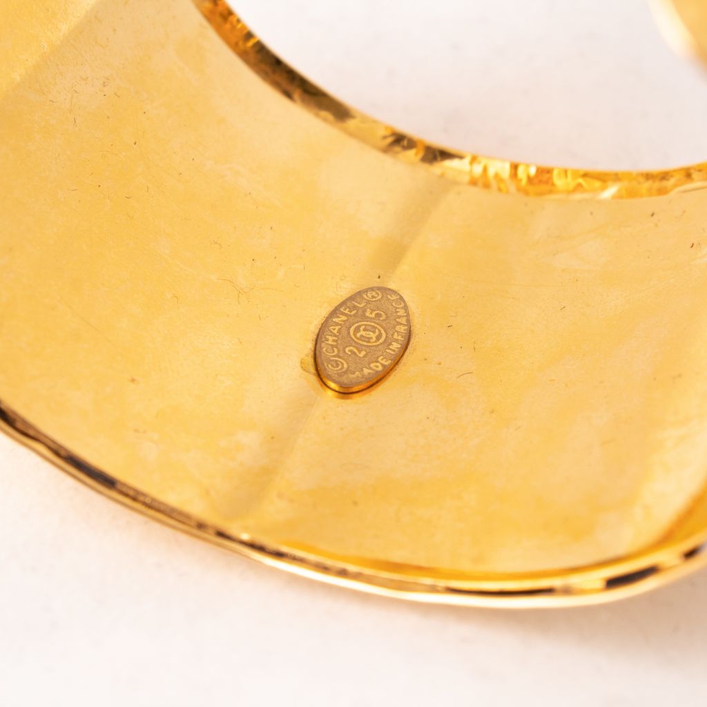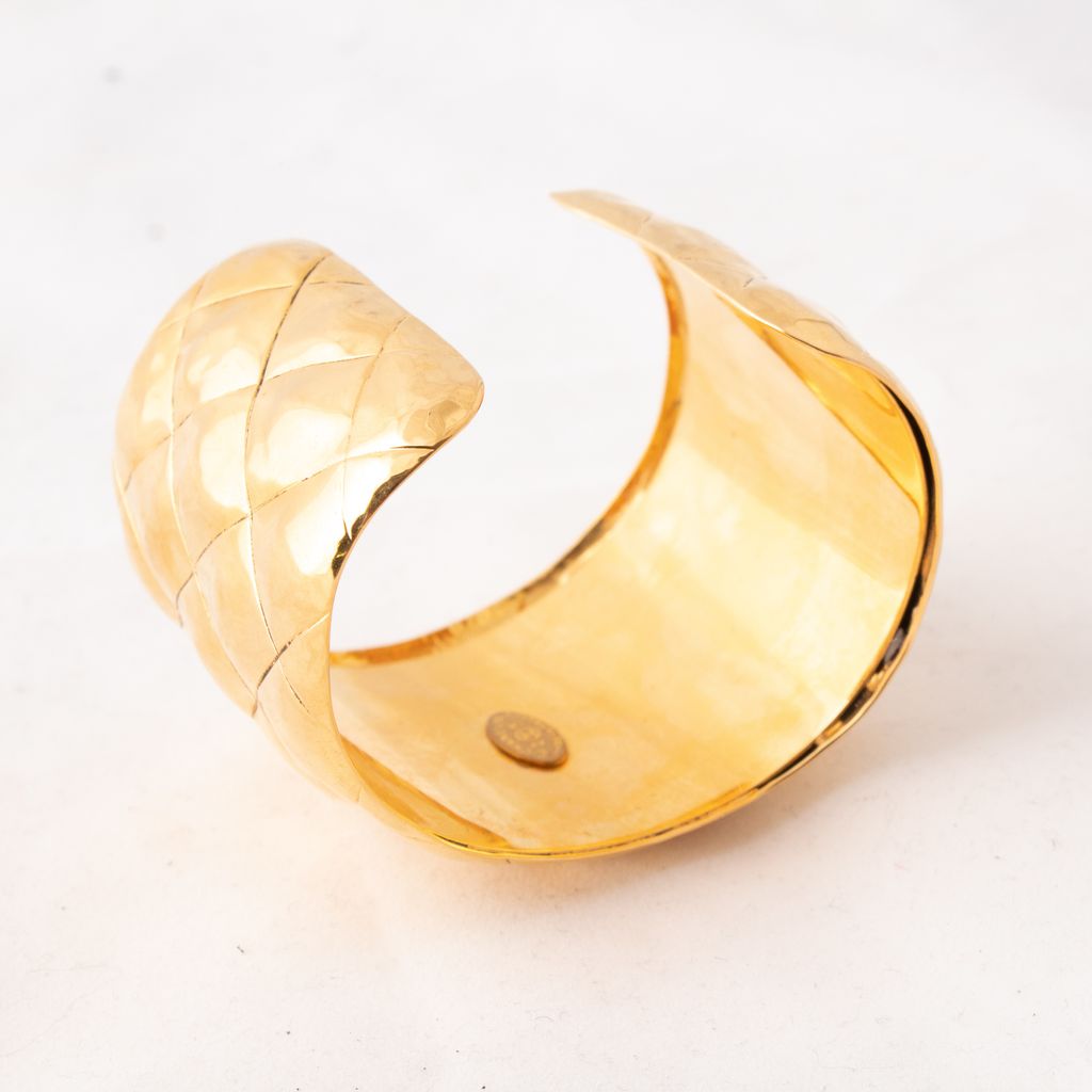 Vintage Chanel bangle in great condition for age. Some minor scratching throughout interior band of bracelet. Features logo stamp and textured weave pattern throughout, inquire with any further questions before purchasing.