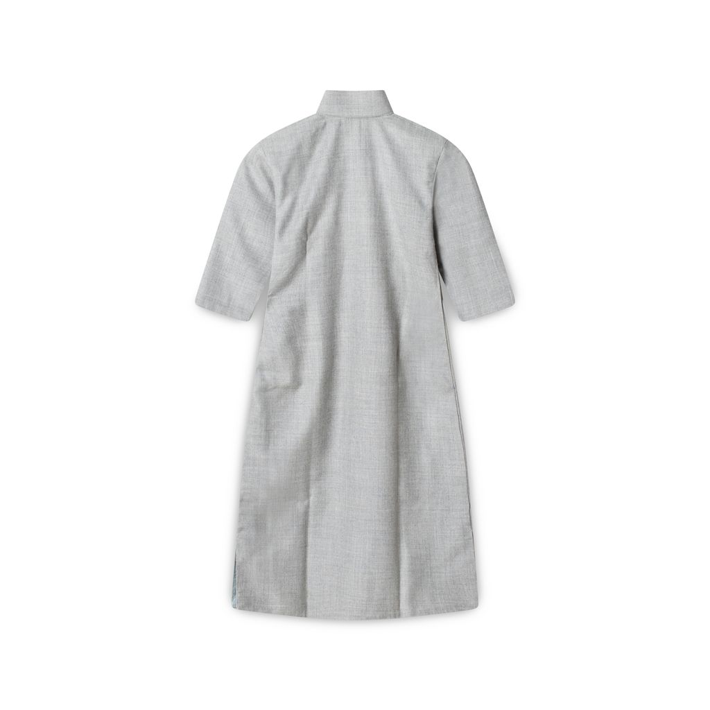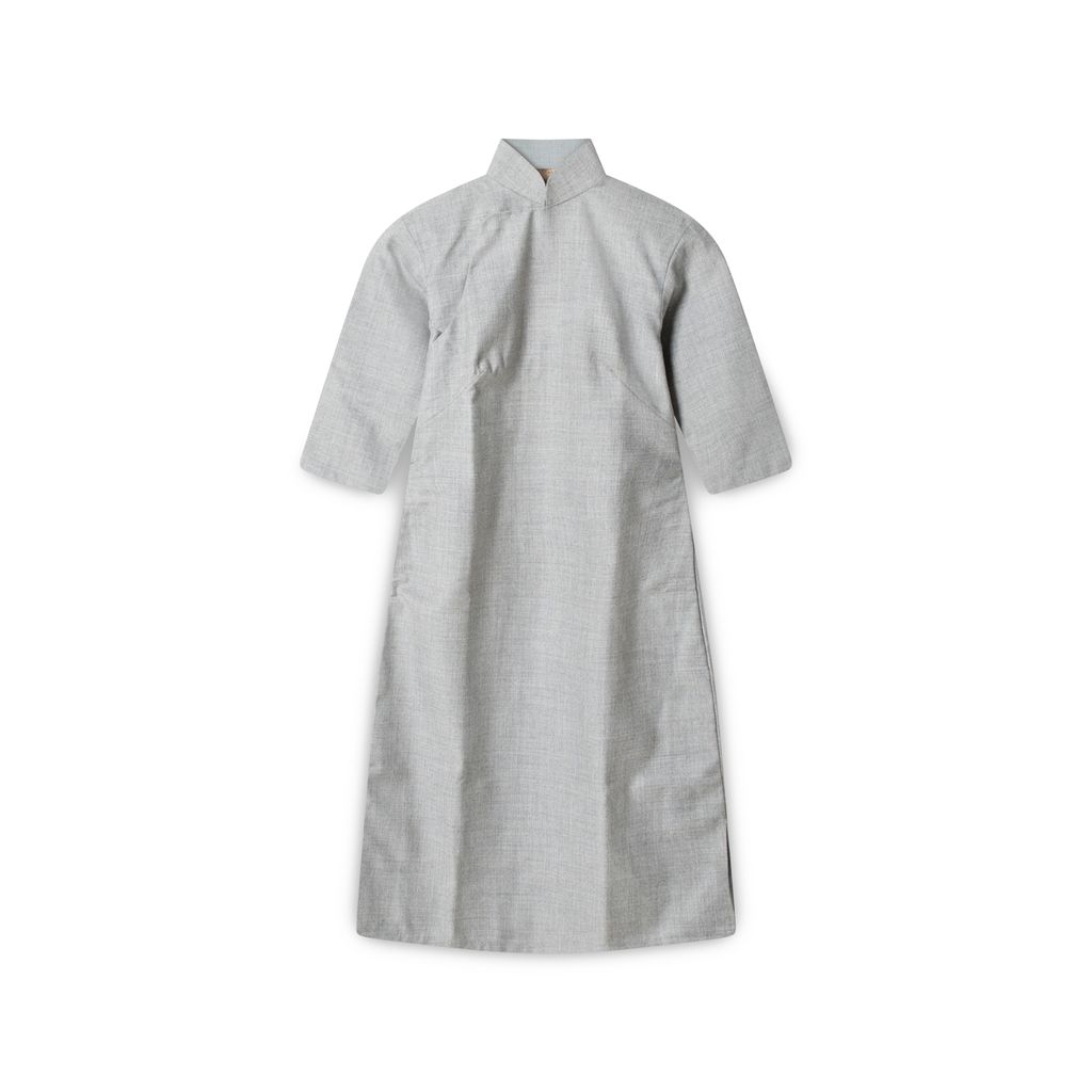 Vintage three quarter sleeves silk-blend cheongsam dress features traditional mandarin collar with closure from center to side arm, and side slits at hem.