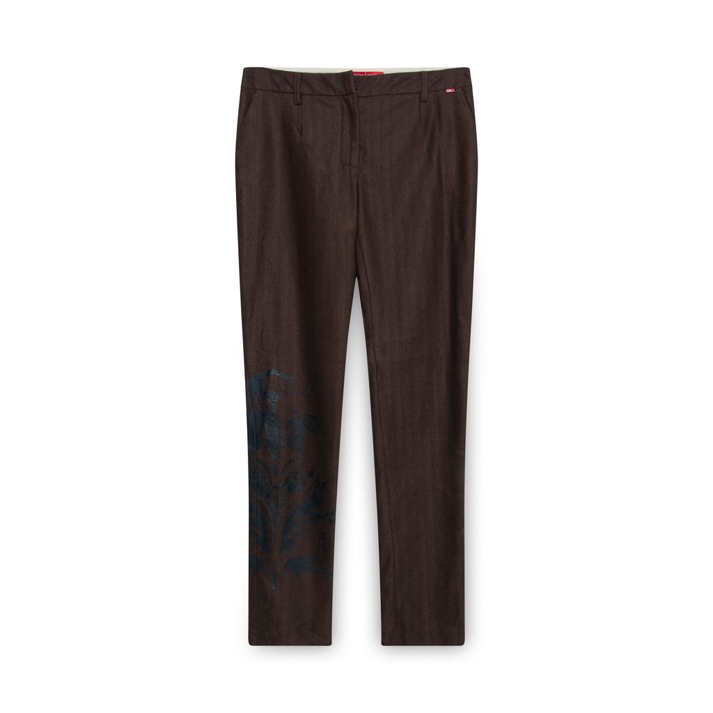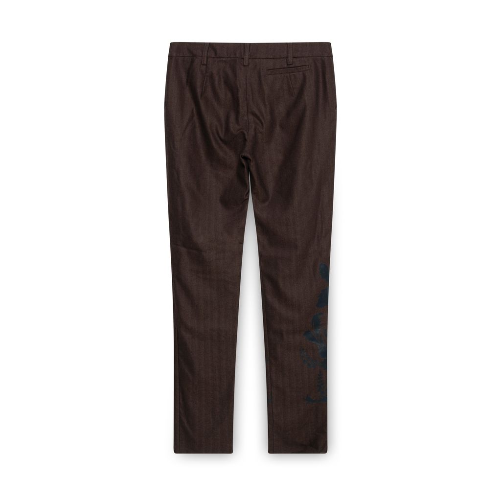 Vintage Christian Lacroix printed wool trousers features tapered legs, printed details at bottom right leg, and zipper/ hook & eye closure.