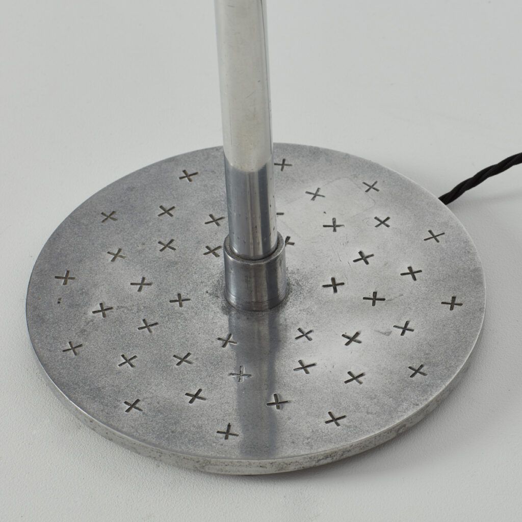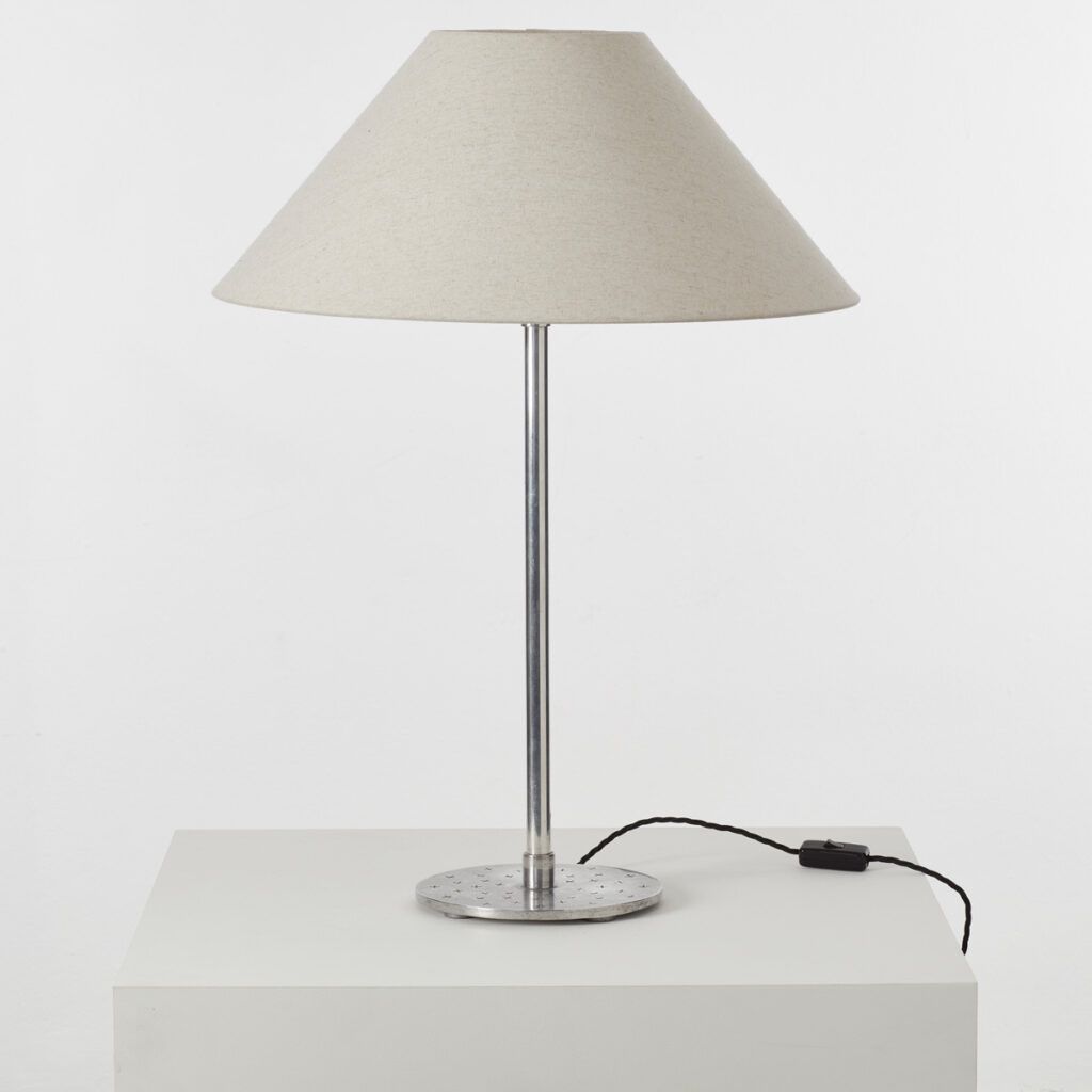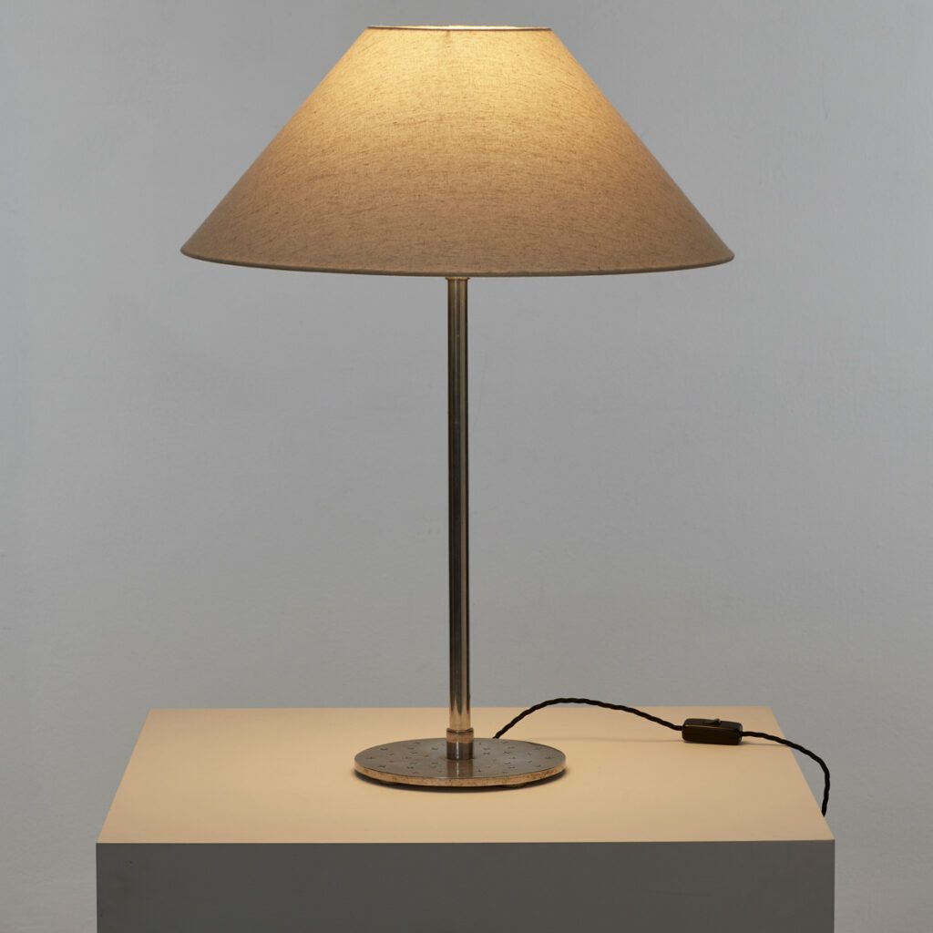 A long out of production tall, chromed table lamp with fabric shade, embellished on the base with a sporadic engraved pattern of small crosses. Marked with original Habitat label on the base of the lamp.