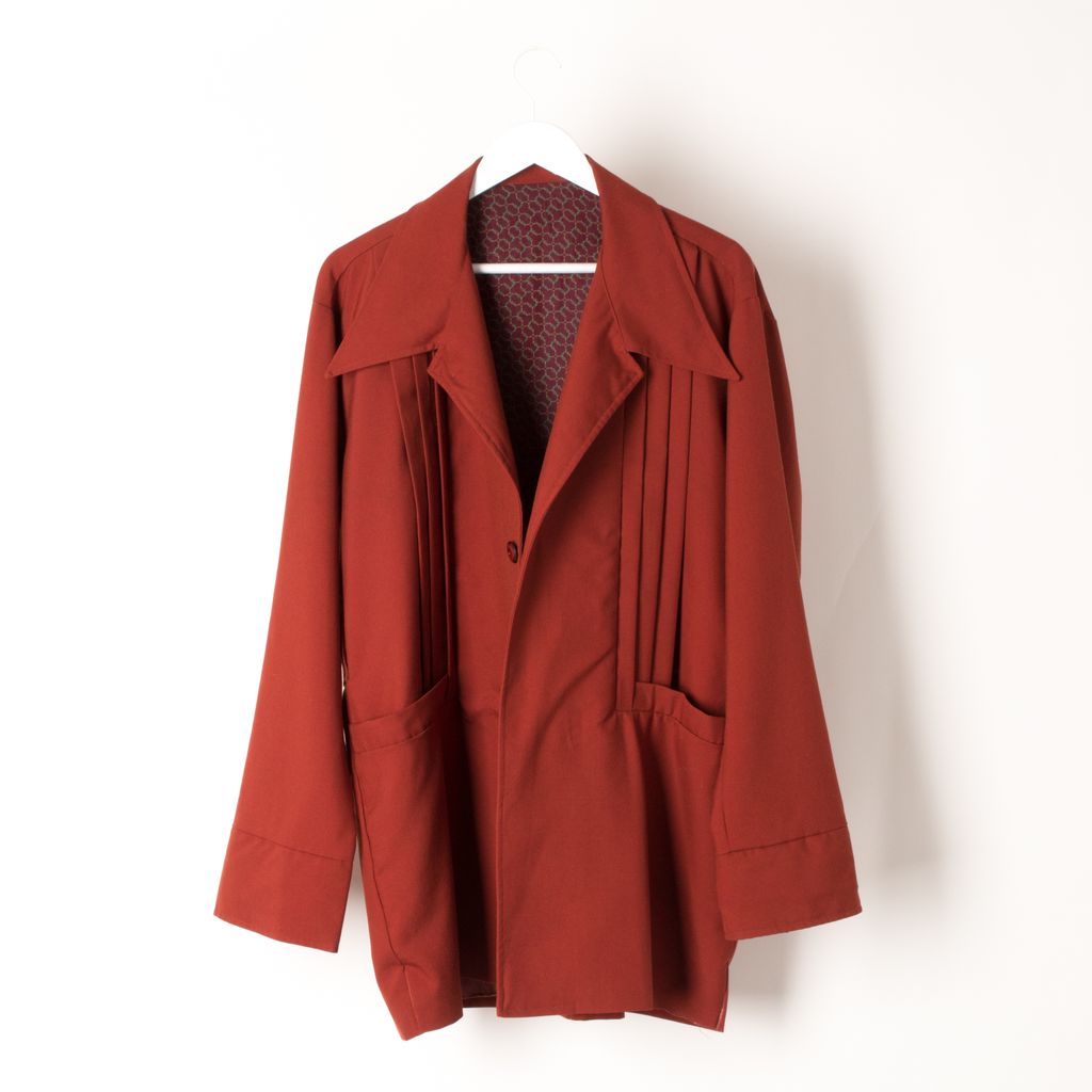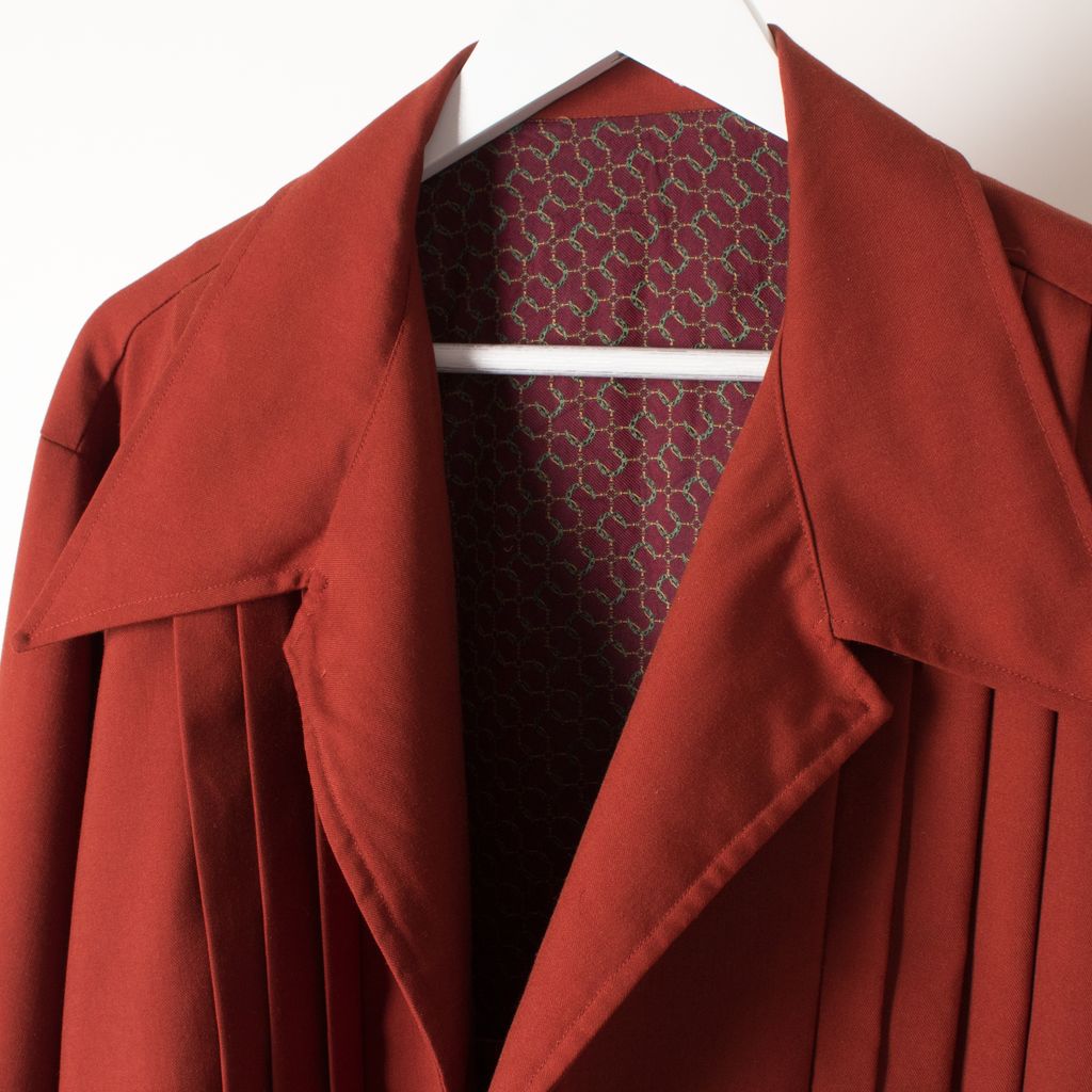 Vintage coat with a three button closure, pleated motif through front, double front pocket and a patterned lining. No sizing information available, measures around 35" in length.