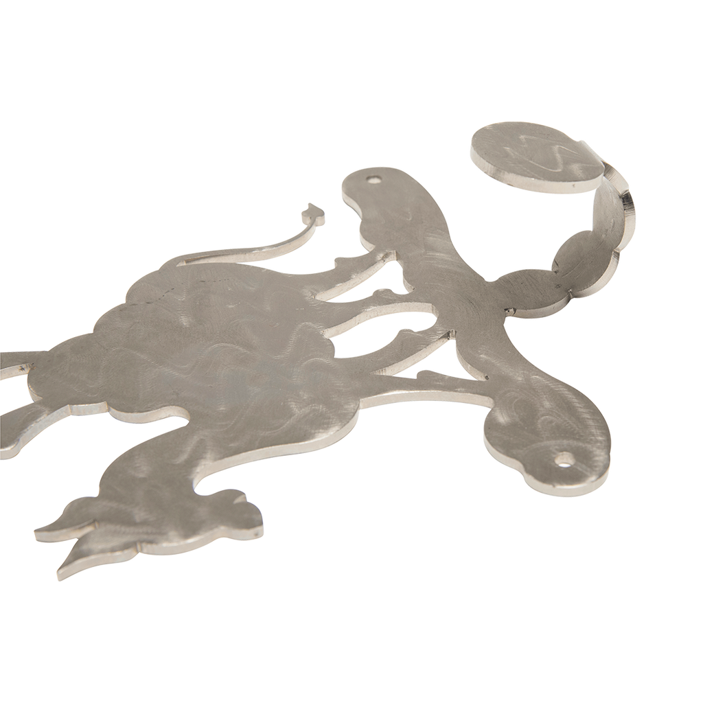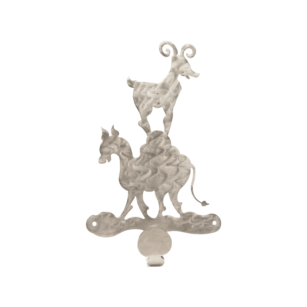 Vintage Coat Hanger by Amy Hess is a vintage brushed steel coat hanger, laser cut in a camel and goat design by artist Amy Hess. It was made in 1992 and artist-signed. Requires mounting screws.