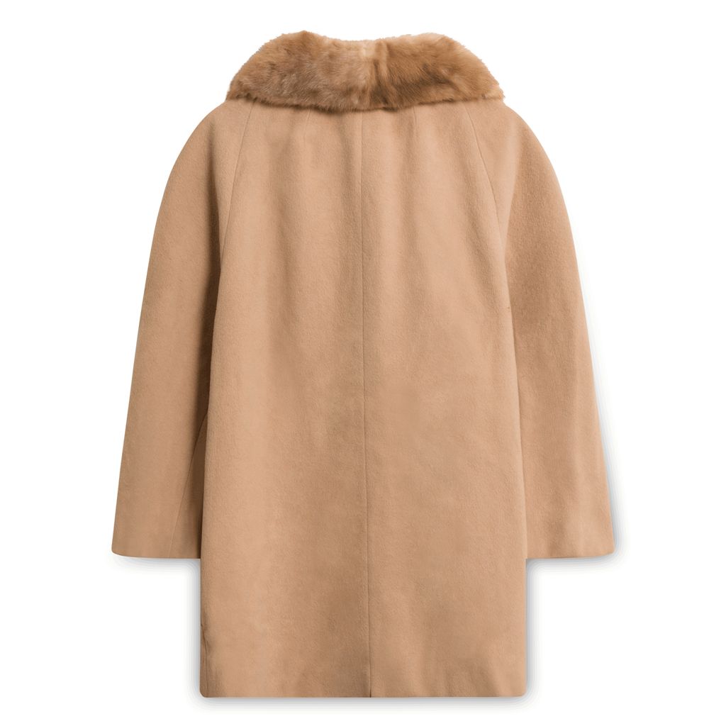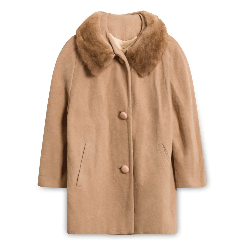This vintage, gorgeous tan coat features a soft, warm exterior enclosed with three large pink buttons. The coat also features a real fur collar and two pockets at the waist. Coat features guaranteed union-made tag.