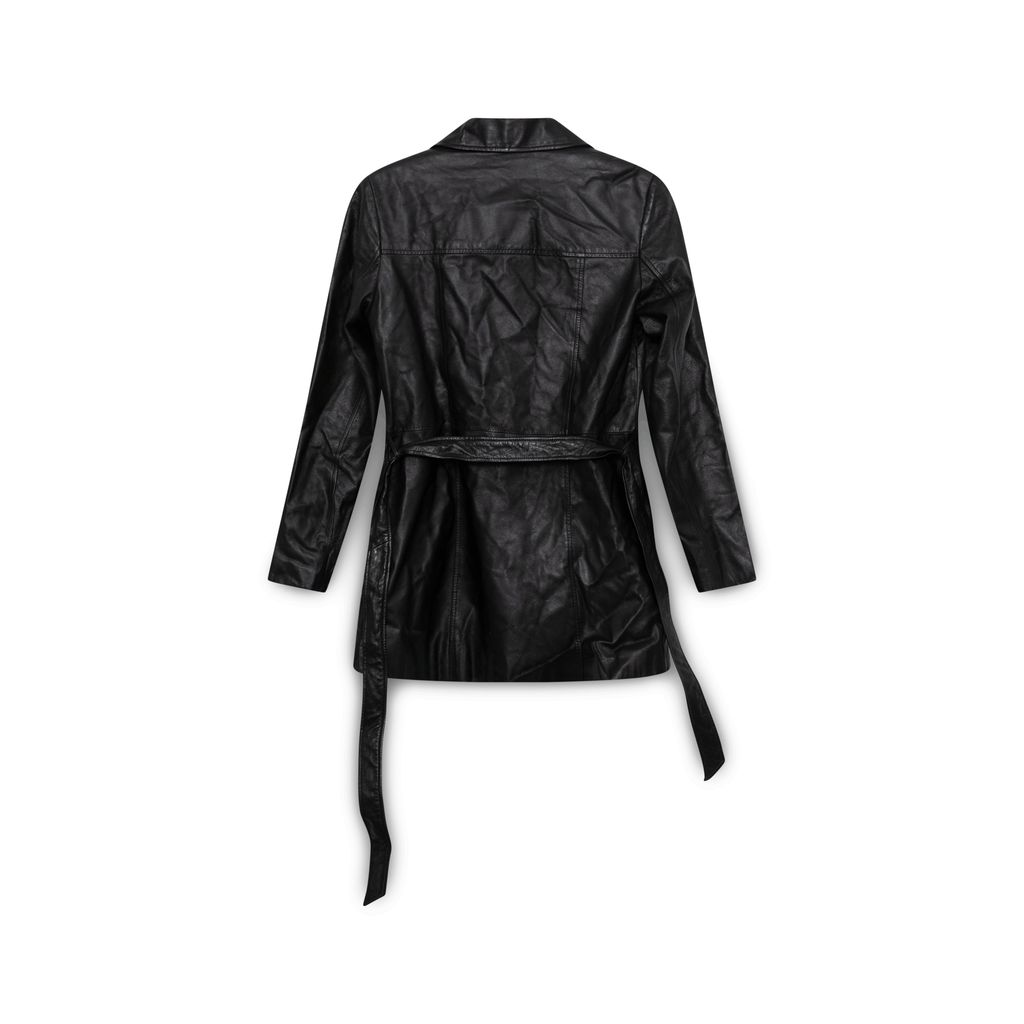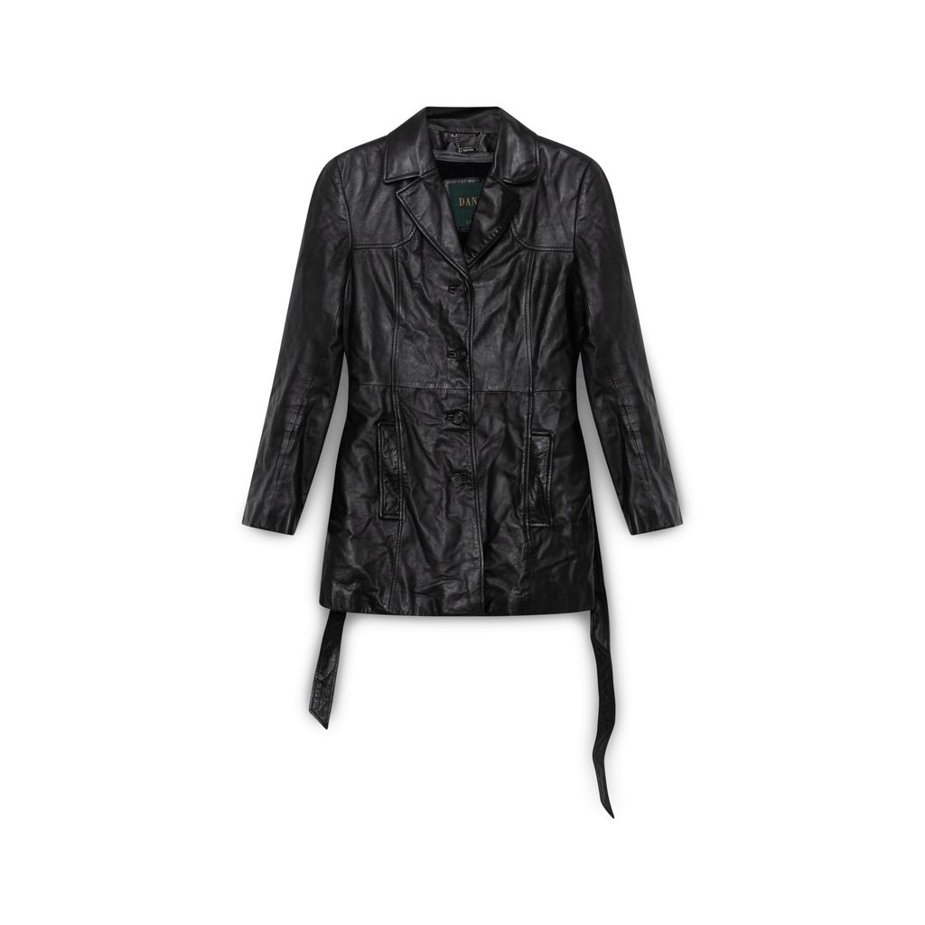 Vintage Danier Leather Coat features button up closure, adjustable waist via straps, side pockets.