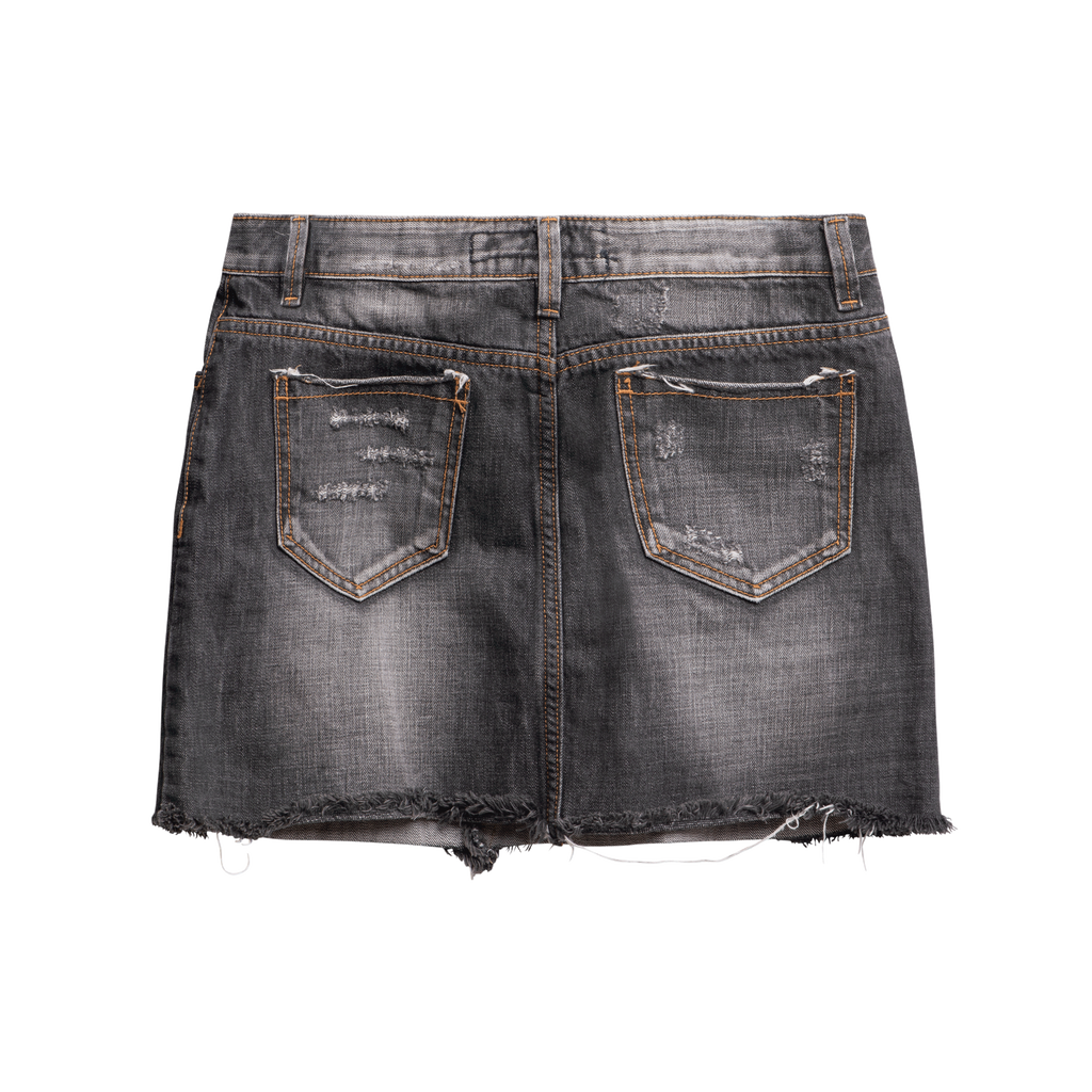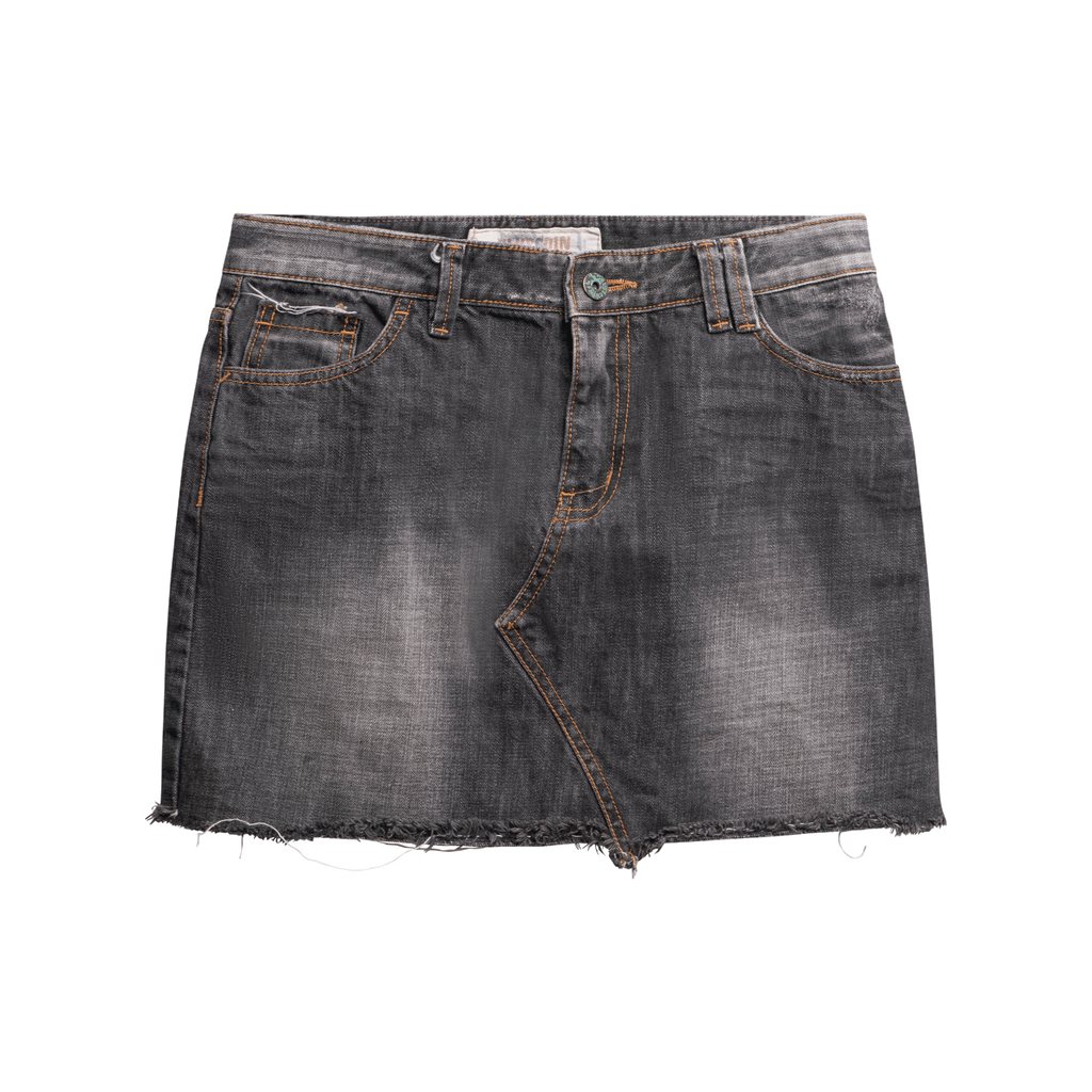 Vintage Denim Skirt features light distressing, zip fly and button closure, 5-pocket styling.