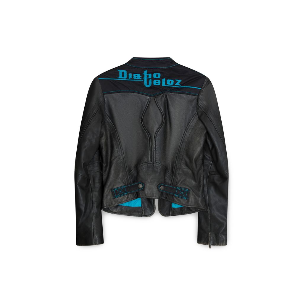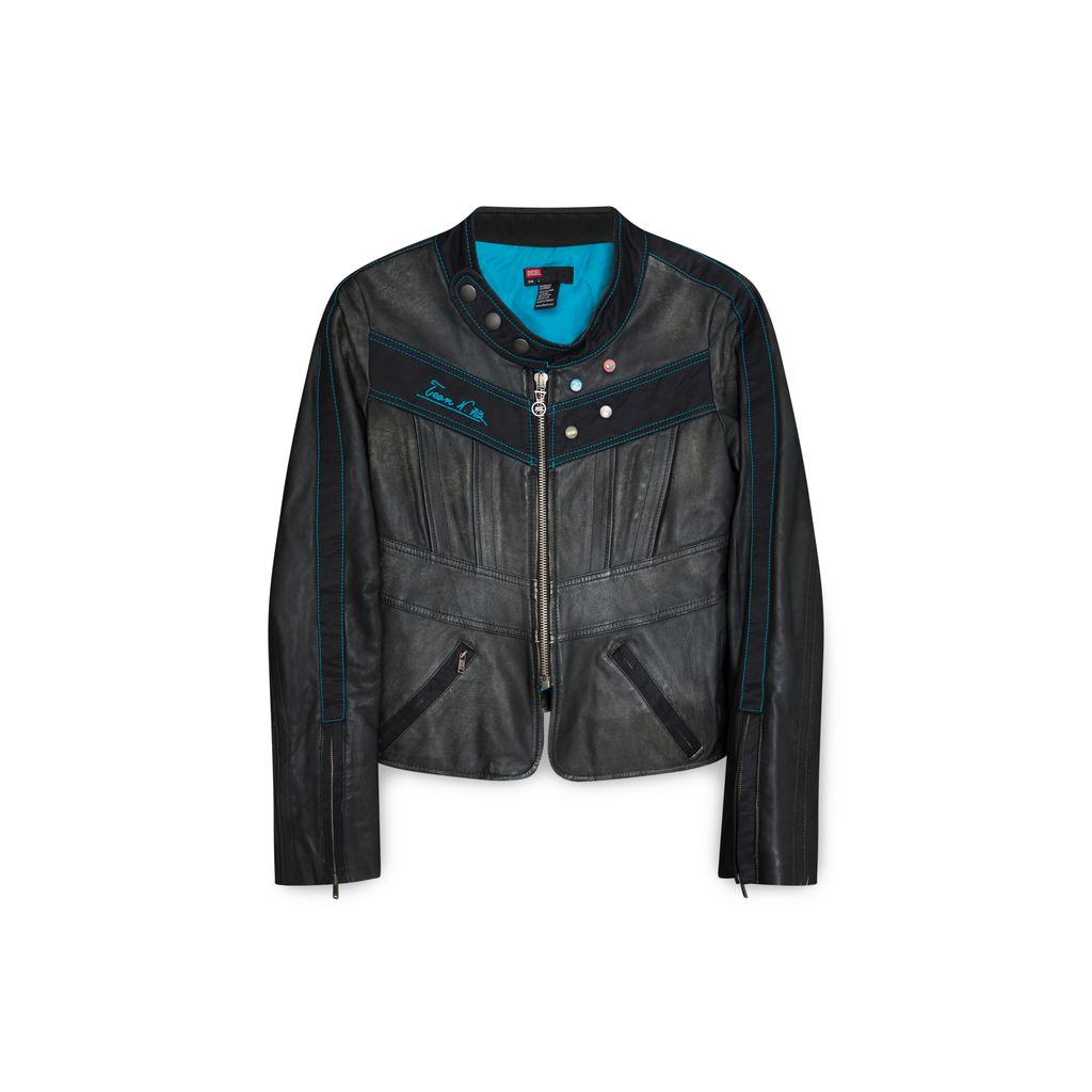 Vintage Diesel Leather Motorcycle Jacket features zipper closure, detail at chest and down sleeves, light blue lining on inside, adjustable hem and collar, zipper pockets and sleeves.