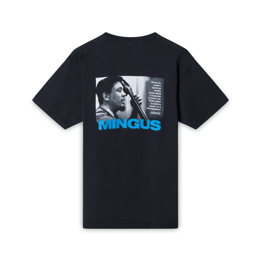 Vintage t-shirt features the DownBeat magazine logo at the chest, and a Charles Mingus graphic and quote on the backside.