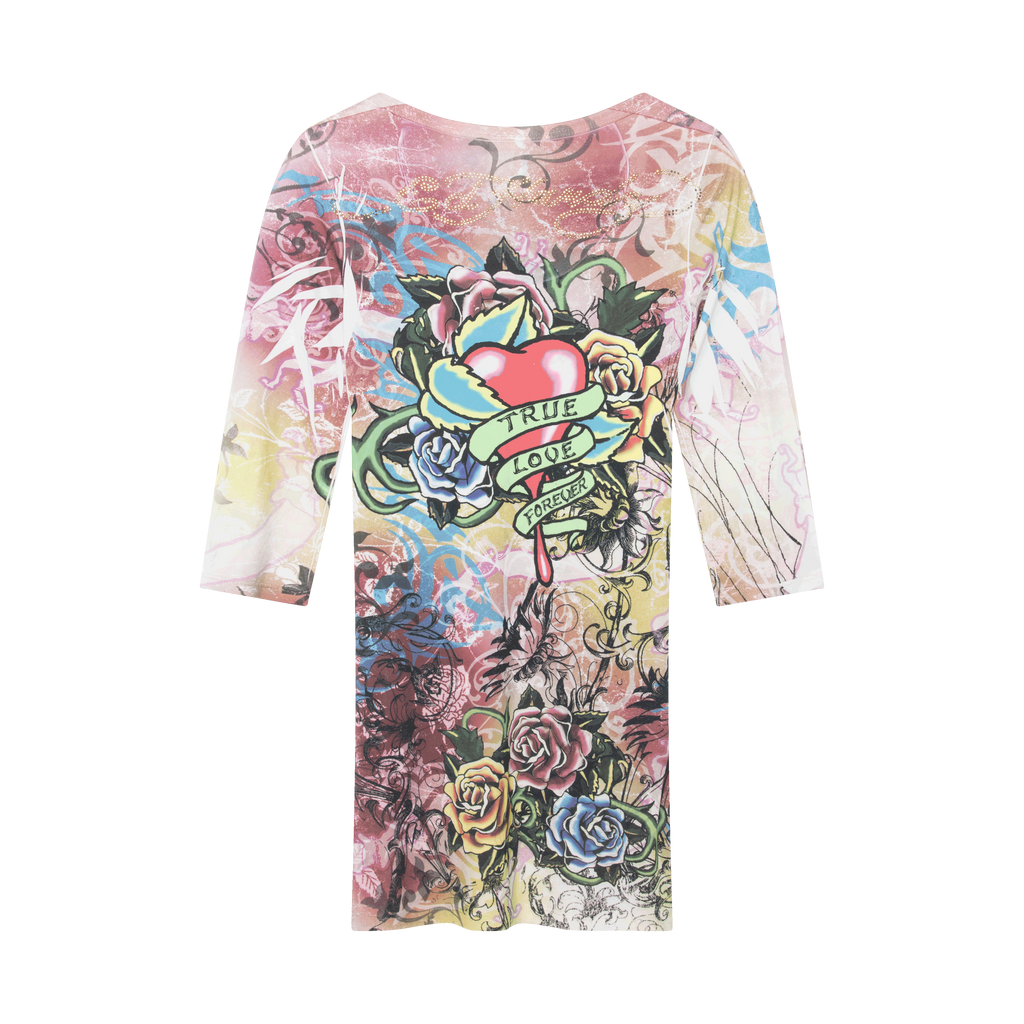 Vintage Ed Hardy Long Sleeve Dress features quarter sleeves, rhinestone detailing on front and back, and mini length.