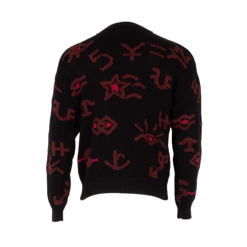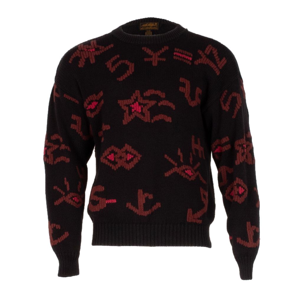 If you're looking for a unique vintage piece, then look no further than these alien hieroglyph looking sweaters from Eddie Bauer. Features all over random character design, drop shoulder sleeves, and thick rib knit bands at neck, wrists, and waist.