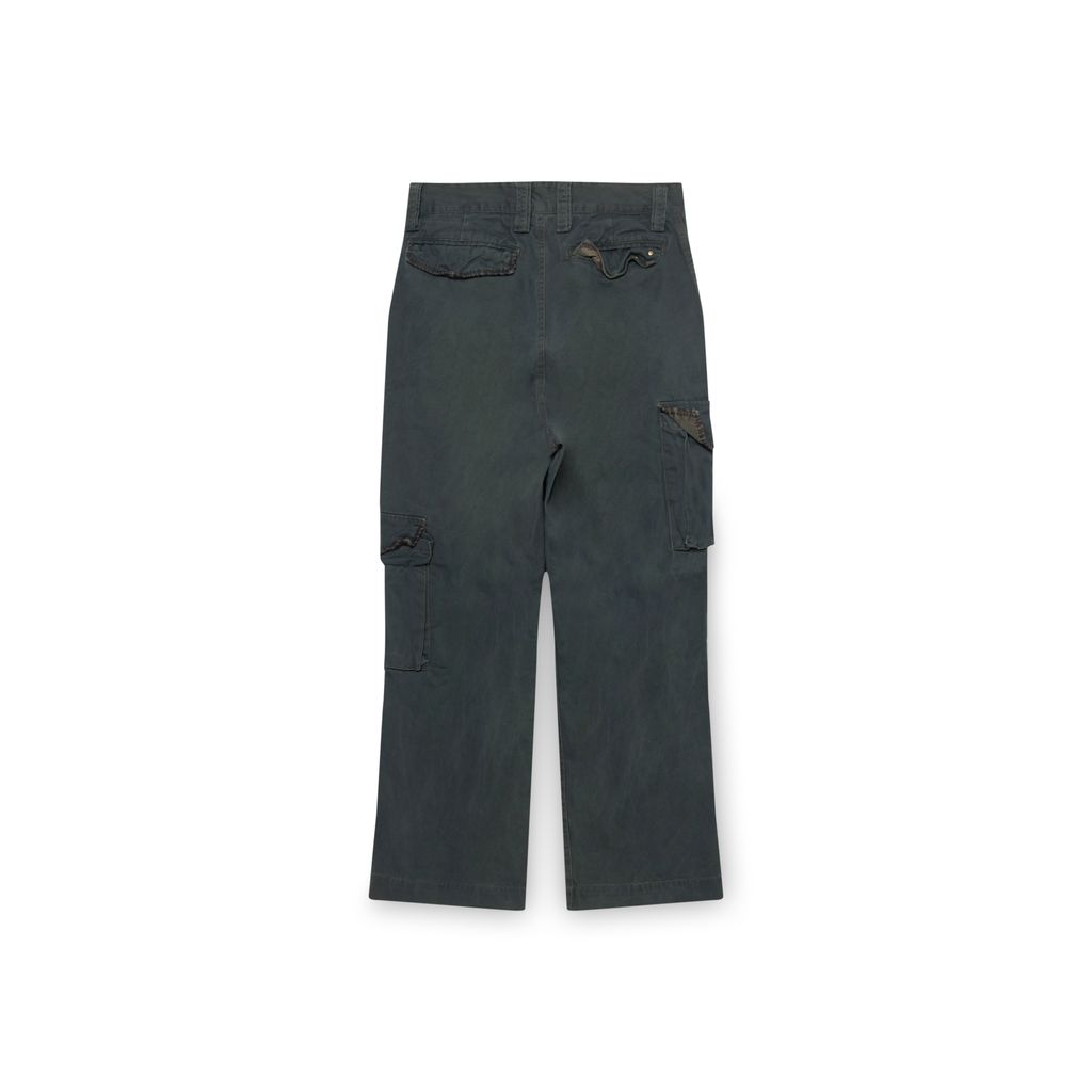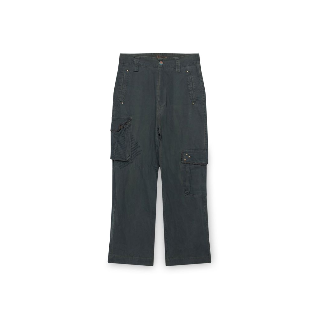 Vintage embroidered cargo pants features straight leg, gold tone hardware throughout, contrast detail stitching on pockets, six pockets, and zipper & button closure at front.