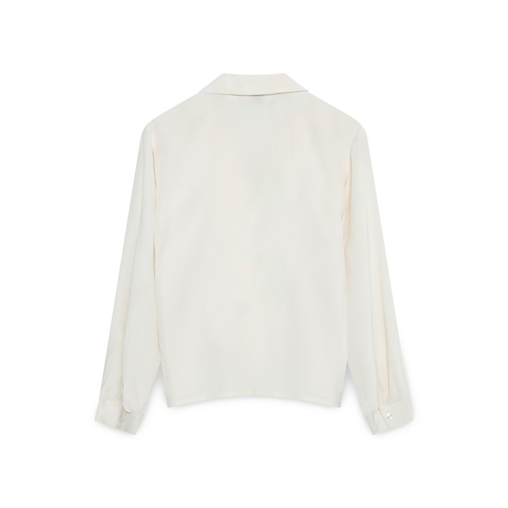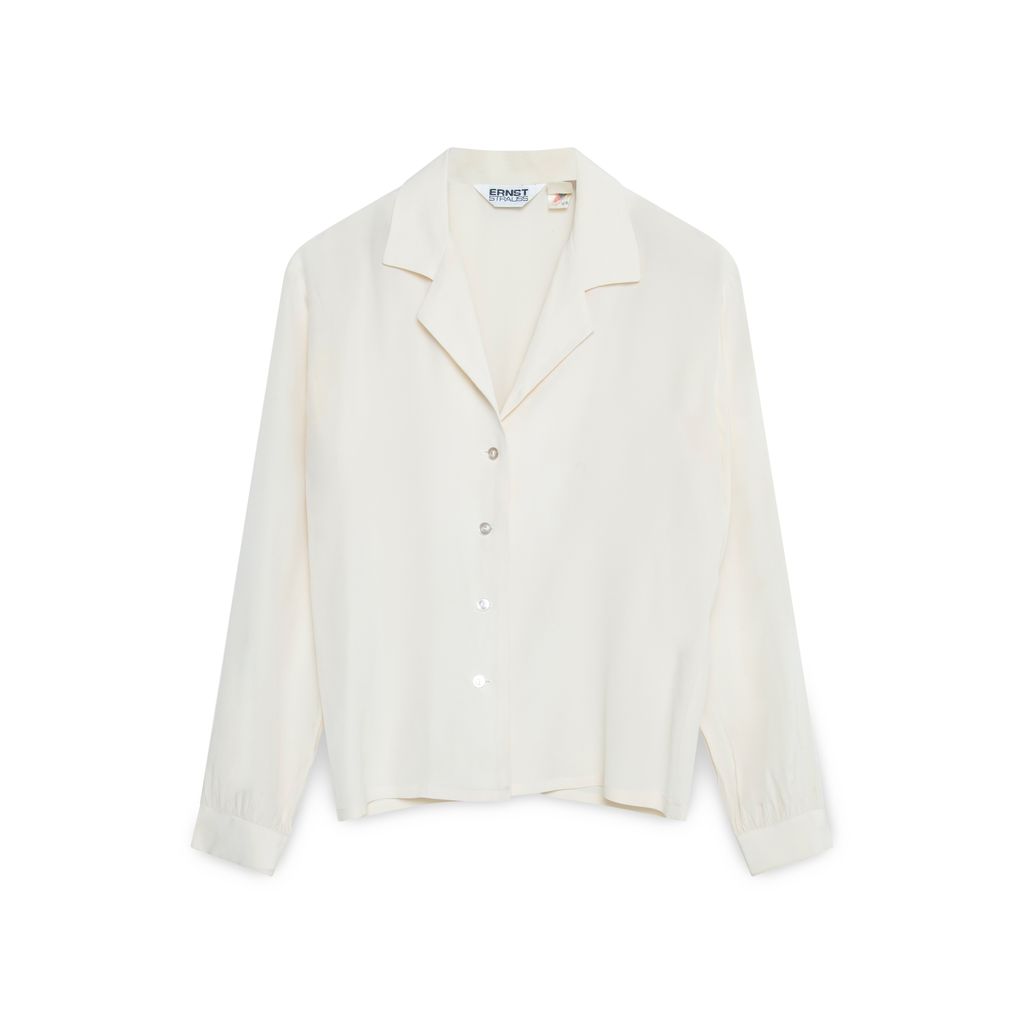 Vintage Ernst Strauss Cream Silk Button Up features V-neck, front button closure, and single button cuffs.