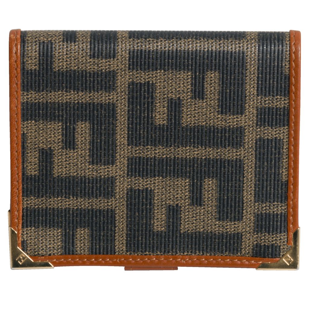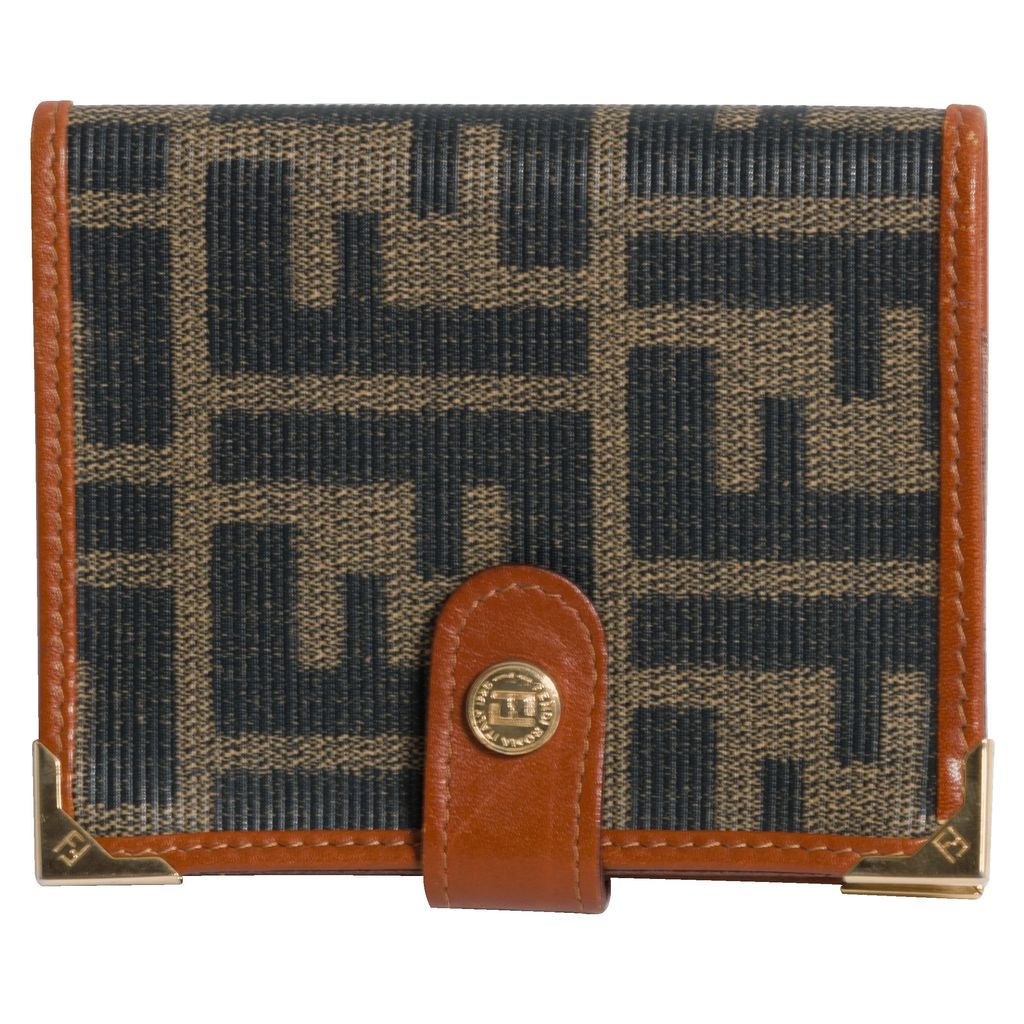 This vintage leather monogram pocket wallet from Fendi features a snap front closure, side pocket, and 8 clear inserts for cards.