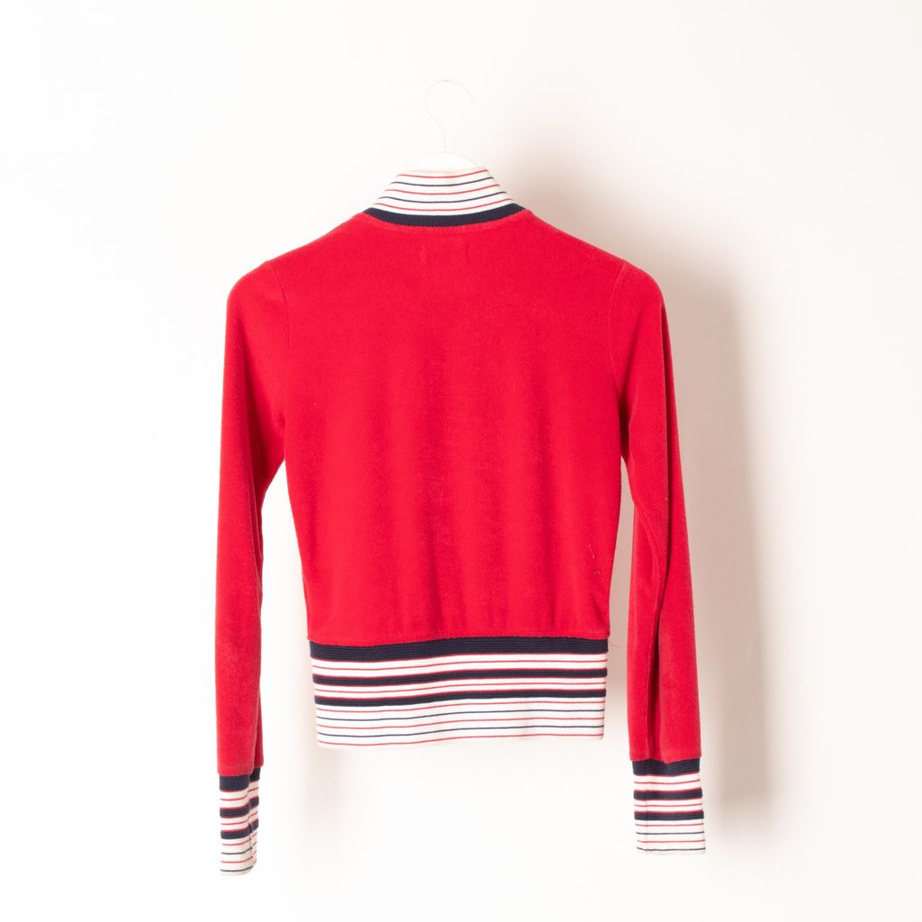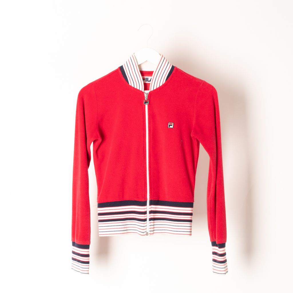 Features some wear and tear akin to a vintage piece. Zip up front, ribbed hemline, embroidered chest logo and an 80% cotton fabric blend.