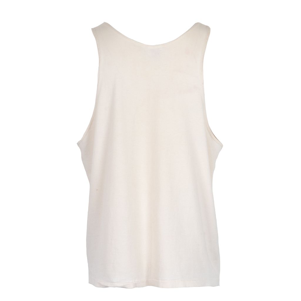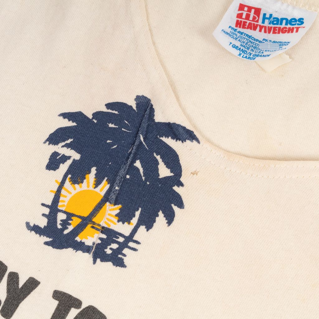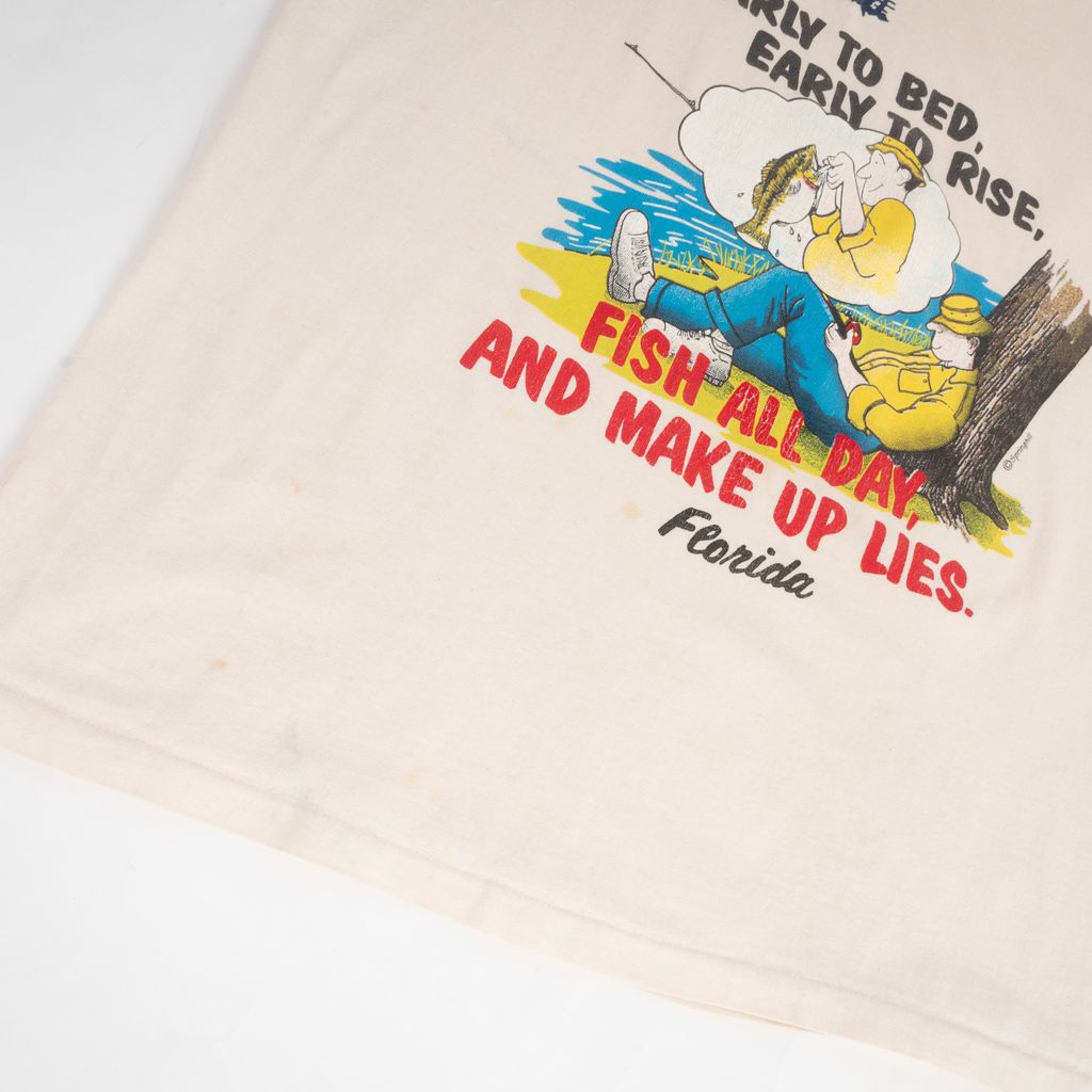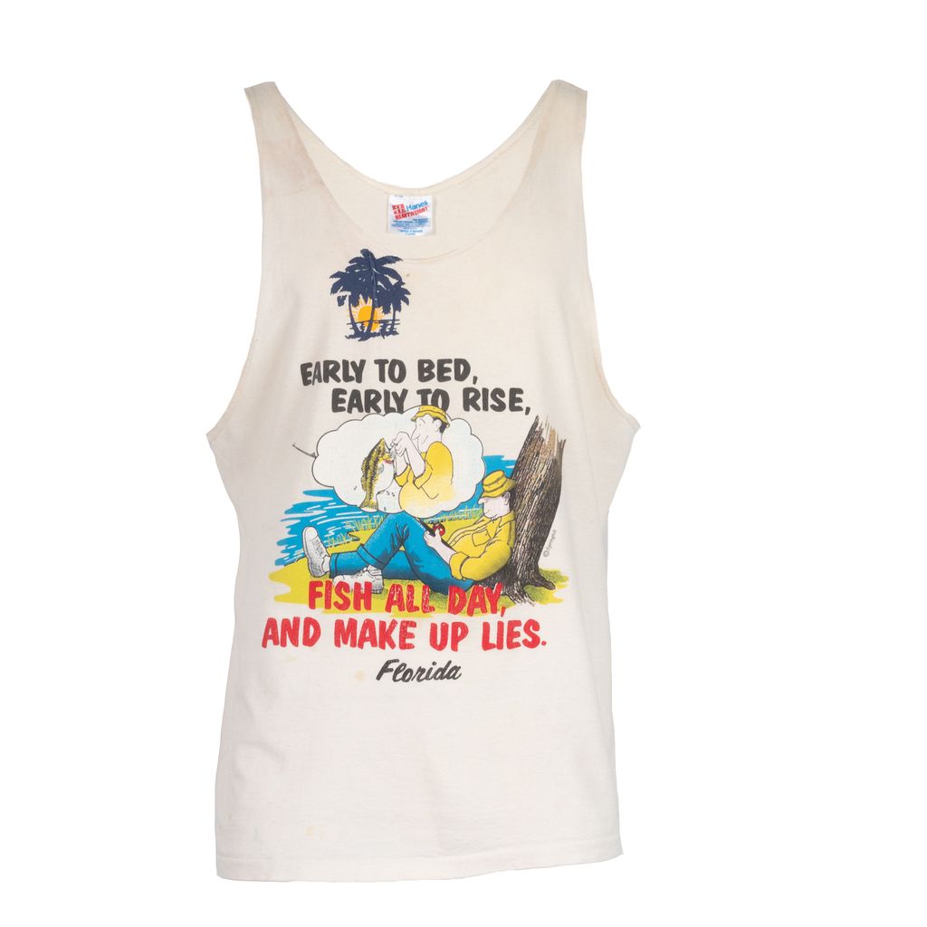 If there's one thing retirees love it's Florida, and if there's one thing Floridians love it's fishing, and if there's one thing we love it's a vintage fishing tank from Florida. Features deep scoop front, wide body shape, low and wide armholes, front fishing graphic, and signs of wear. Signs of wear include staining throughout as photographed.
