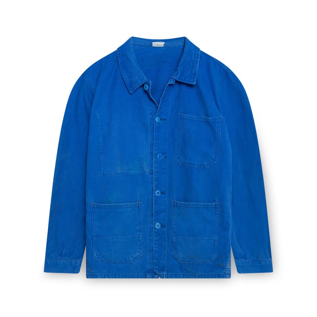 Vintage French work jacket features classic collar, three pockets at front, and frontal button closure.