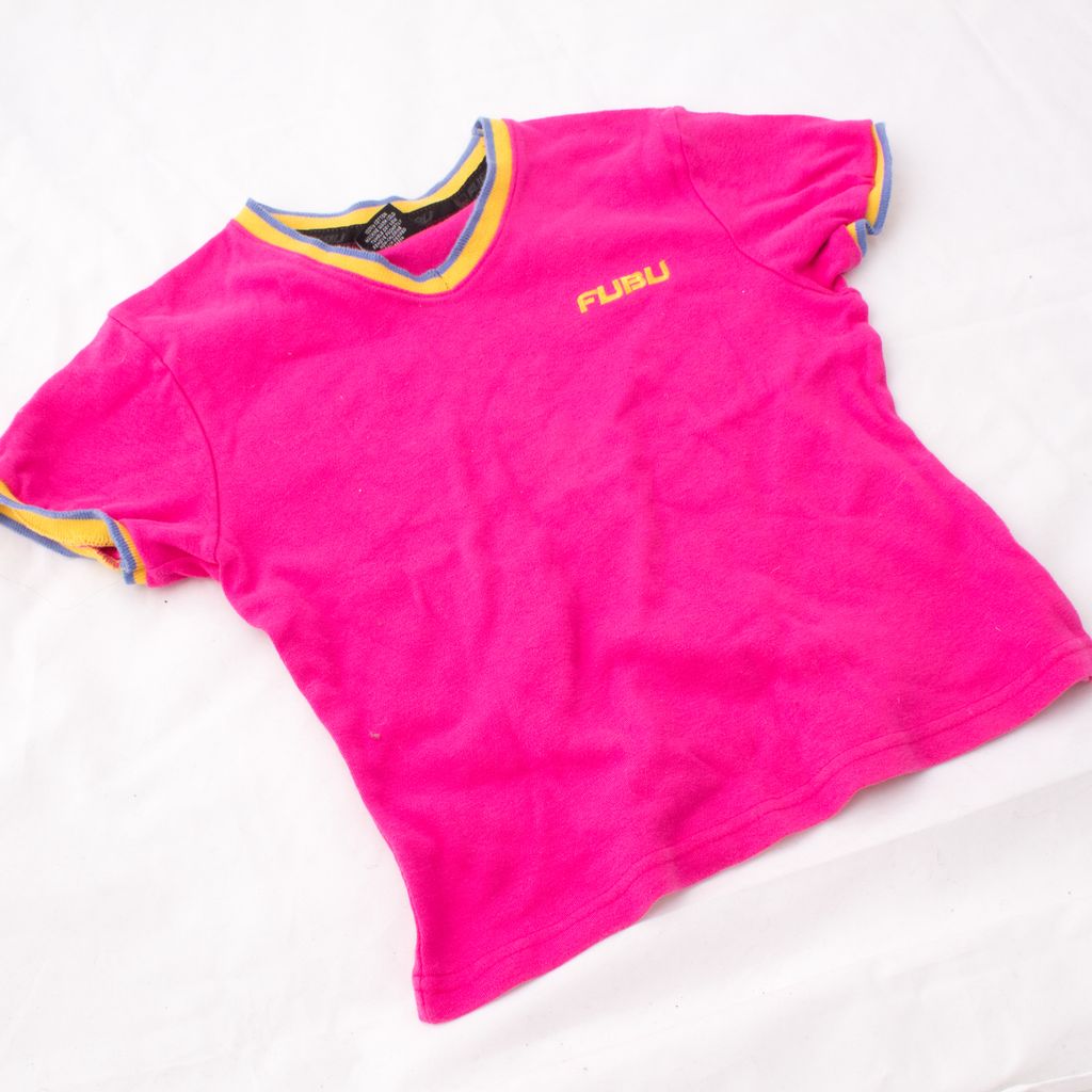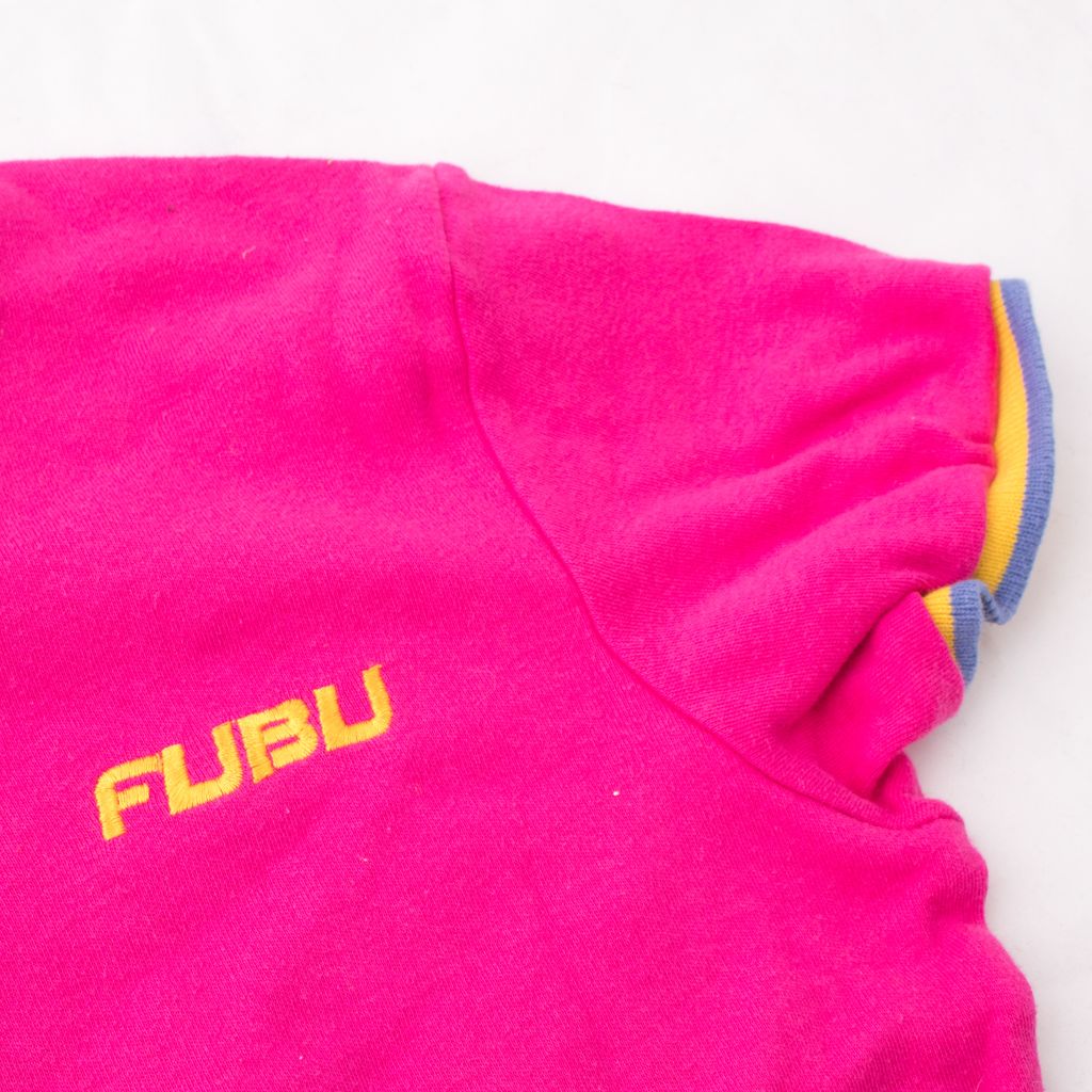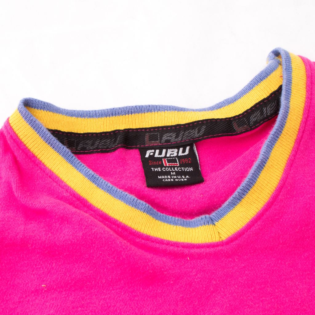 Vintage FUBU top in pink with yellow and lilac lining along the sleeve and neck openings, v-neck, gently worn.