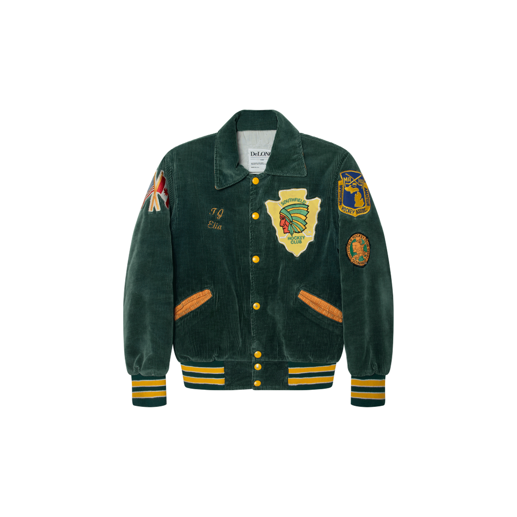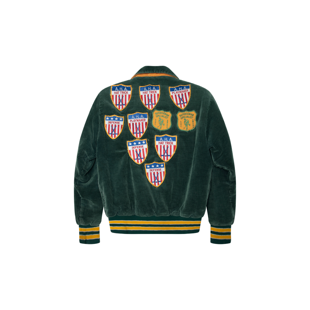 Vintage Green Hockey Varsity Jacket features corduroy material, green and yellow ribbed cuffs and hem, front snap button closure, 2 front pockets, and embroidery and patchwork details all over.