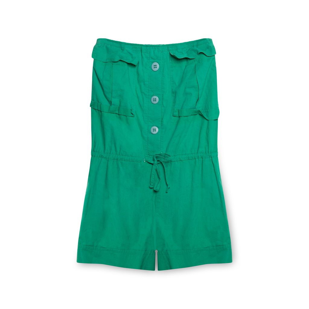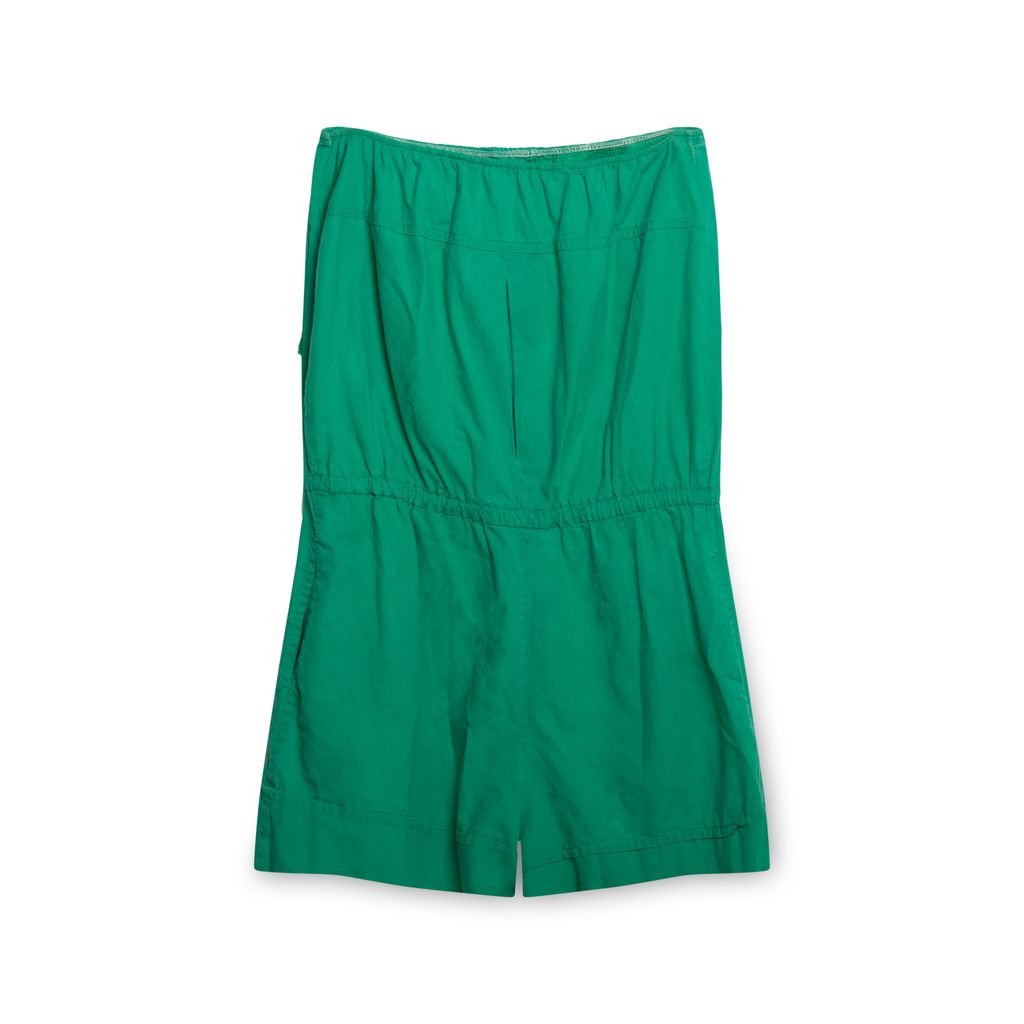 Vintage Green Strapless Romper features elasticated chest and waist, cuffed shorts, front button closure, adjustable waist drawstring,