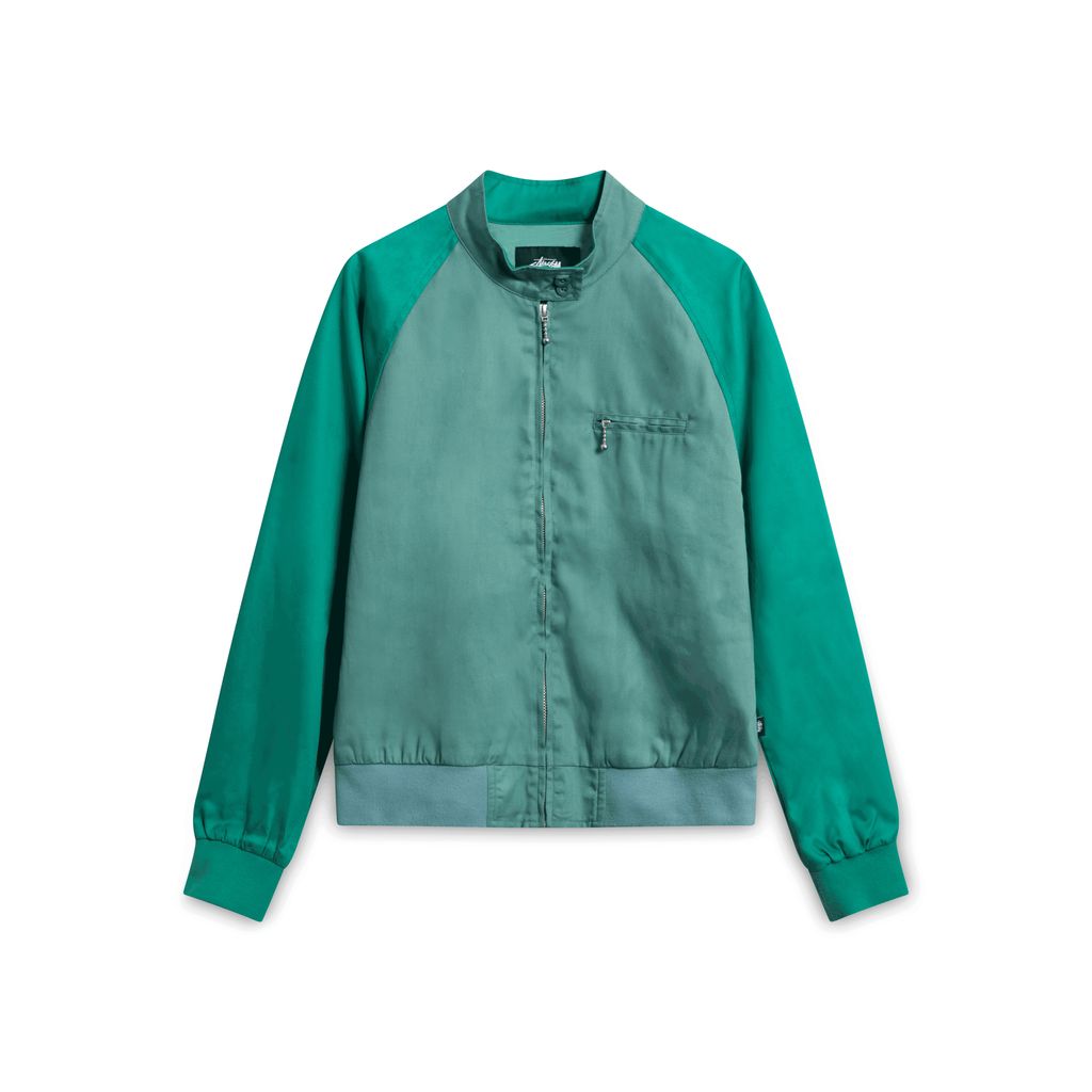 Vintage Stussy Jacket in Green features dark green trim and lining, front buttoned collar, left chest pocket, and zipper enclosure.