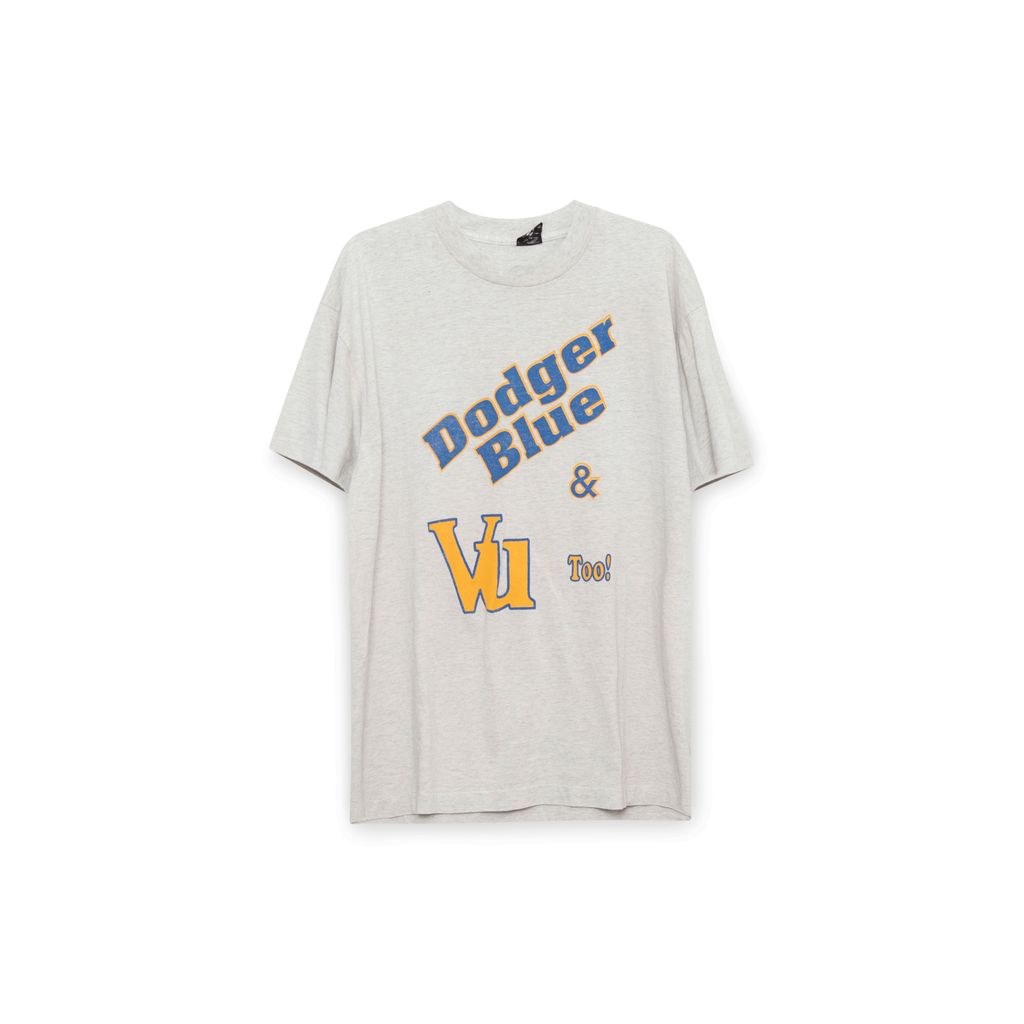Vintage Grey Tee Shirt features blue and yellow wording and short sleeves.