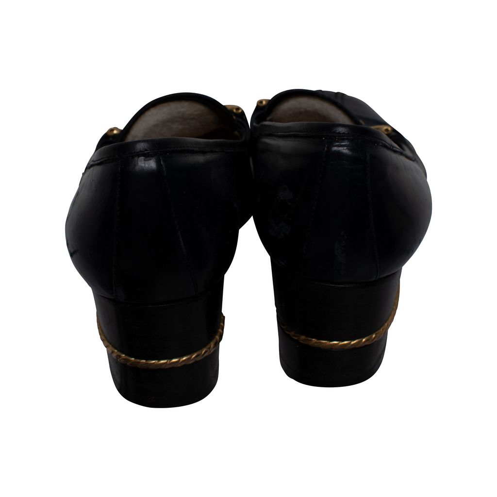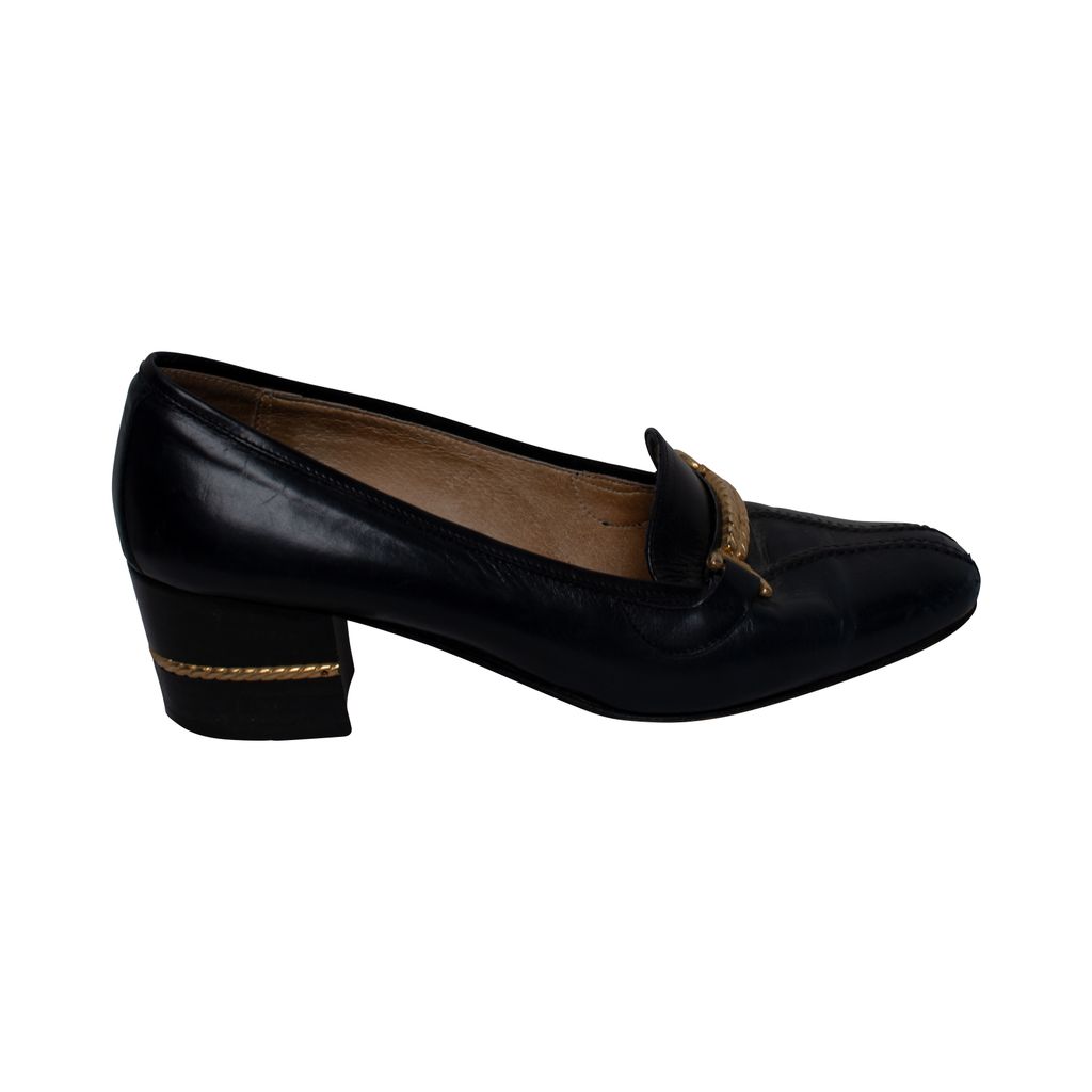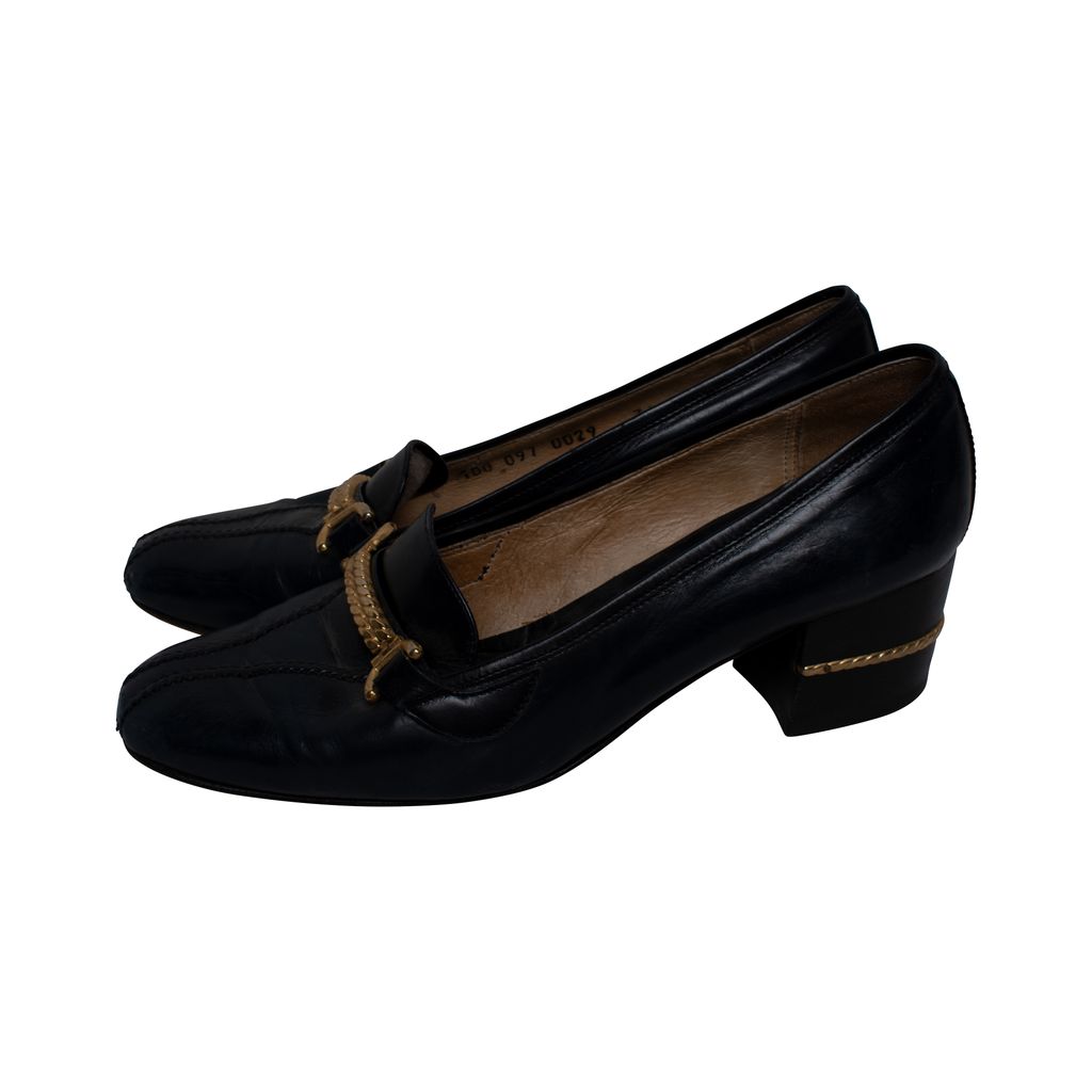 Vintage Gucci pumps features, stitching details at closed toes, gold hardware details at uppers and heels, and 2" heels.
