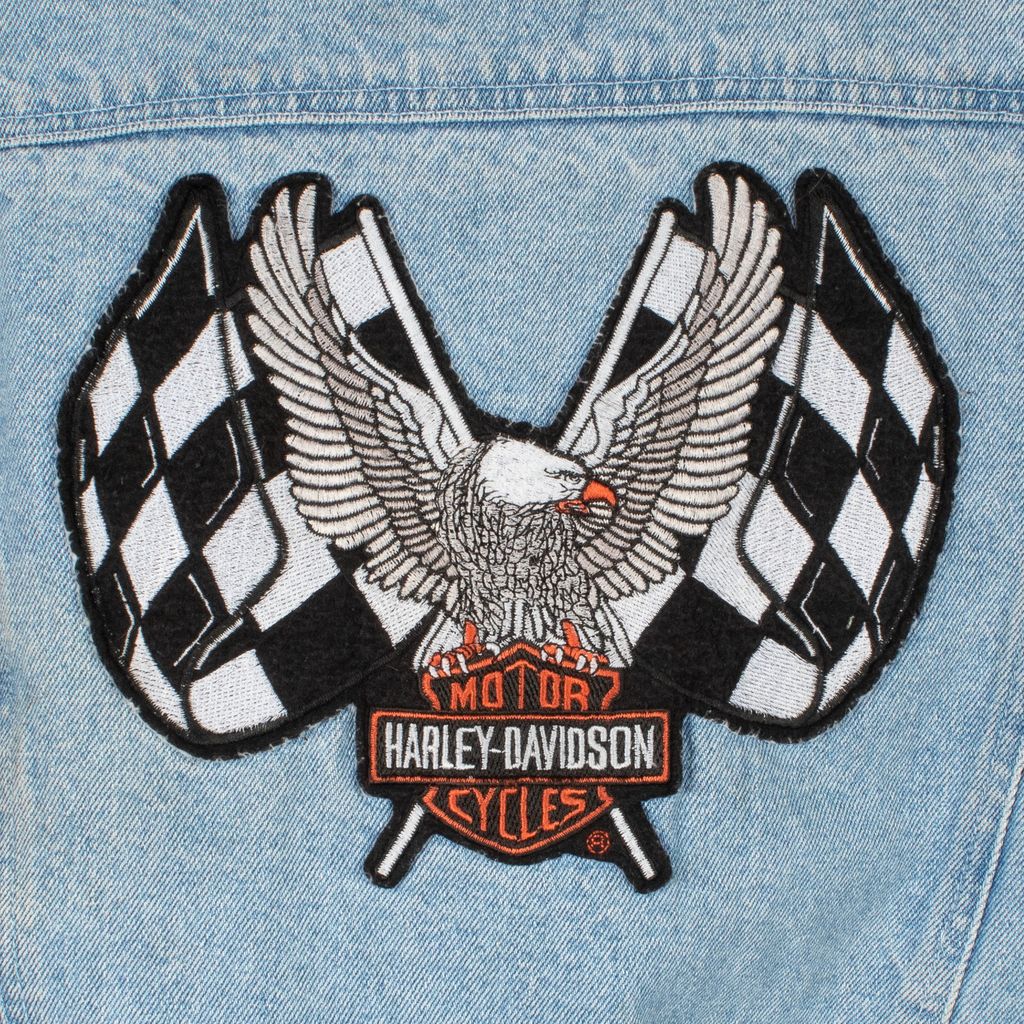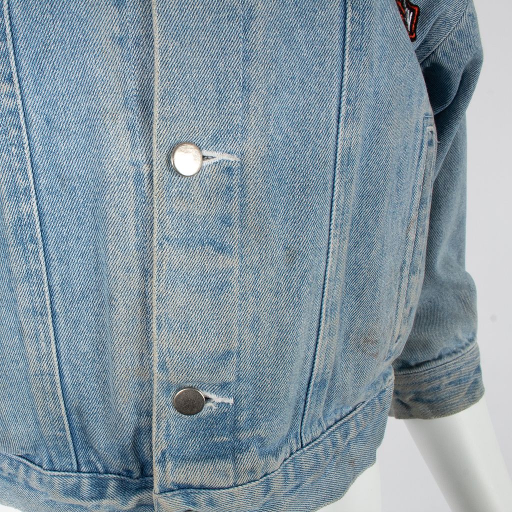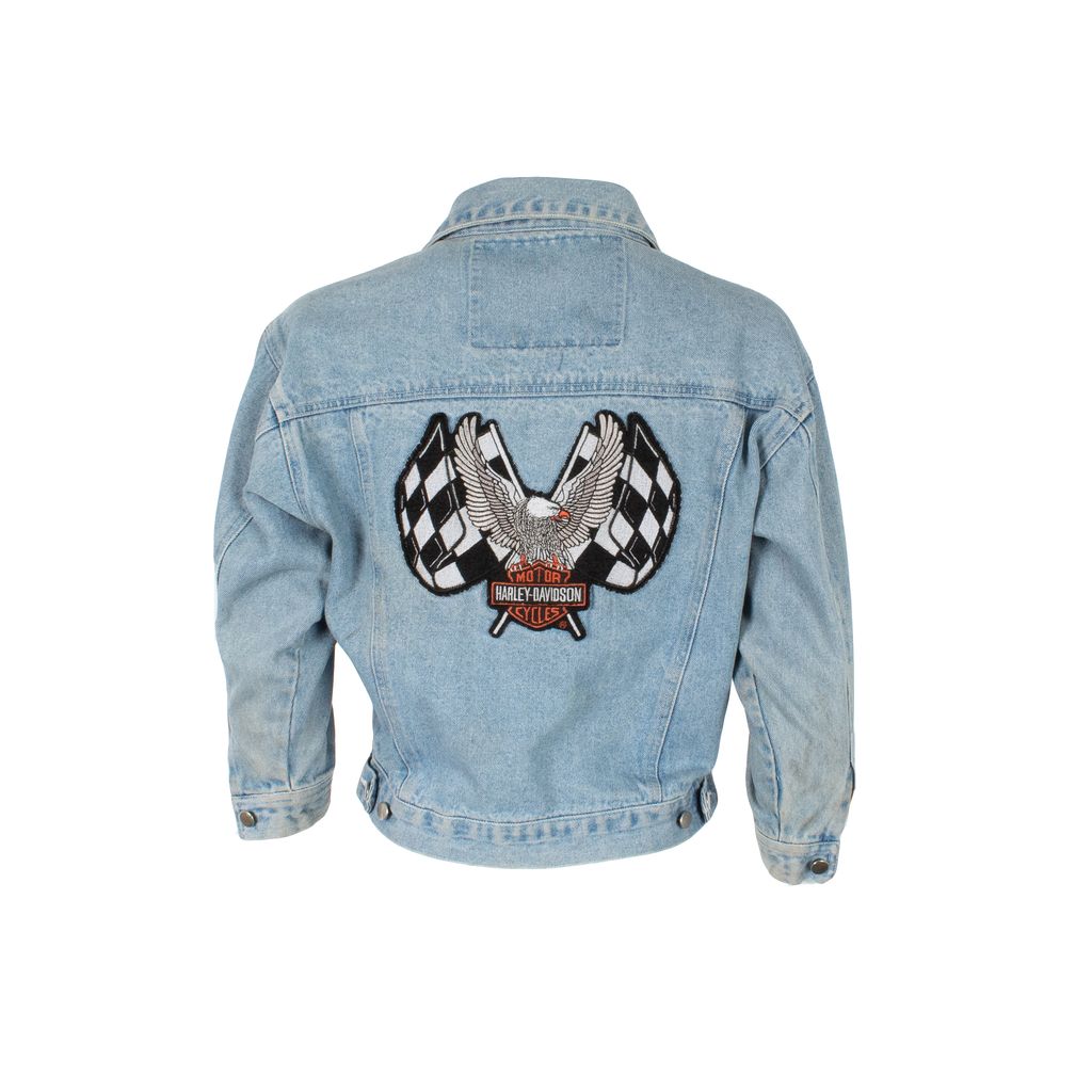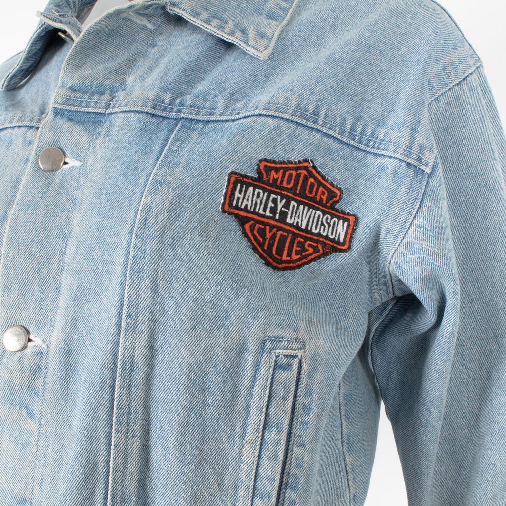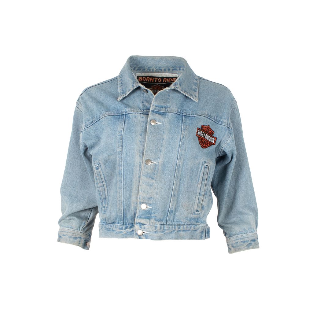Get your Lana Del Rey on and just ride in this Harley Davidson emblazoned cropped denim jacket. Features cropped body silhouette, button front closure, Harley Davidson logo patch on left side of chest, vertically placed welted pockets on front, 3/4 length sleeves, Harley Davidson eagle and flag back patch, and minor signs of wear. Signs of wear include staining throughout as photographed.