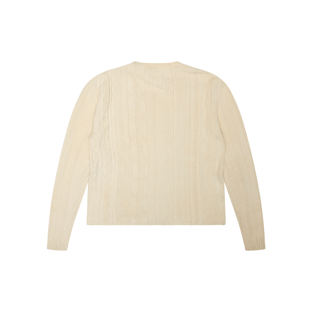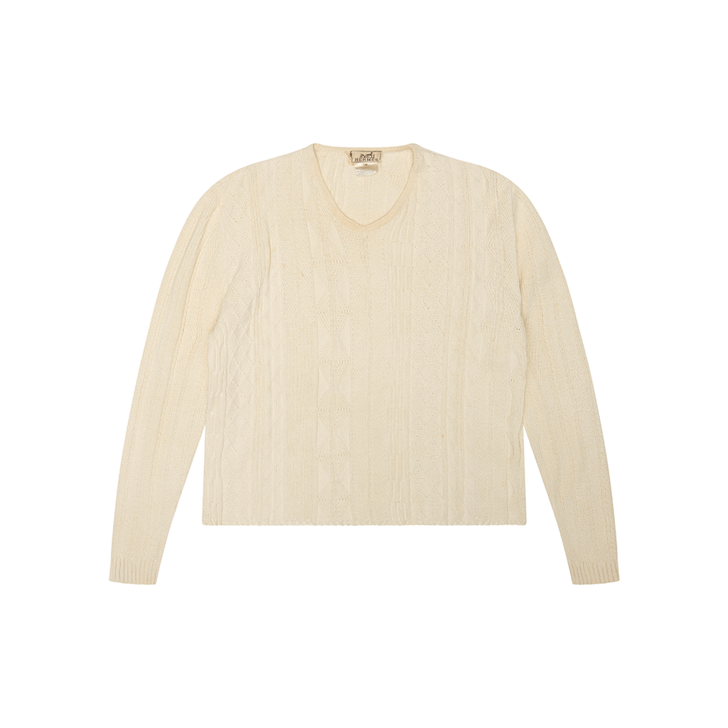 Vintage Hermés Cream Cable Knit Sweater features V-neck, dropped shoulders, and cable knit design.