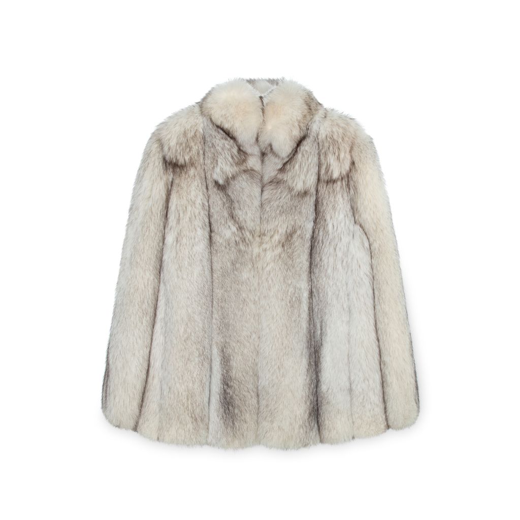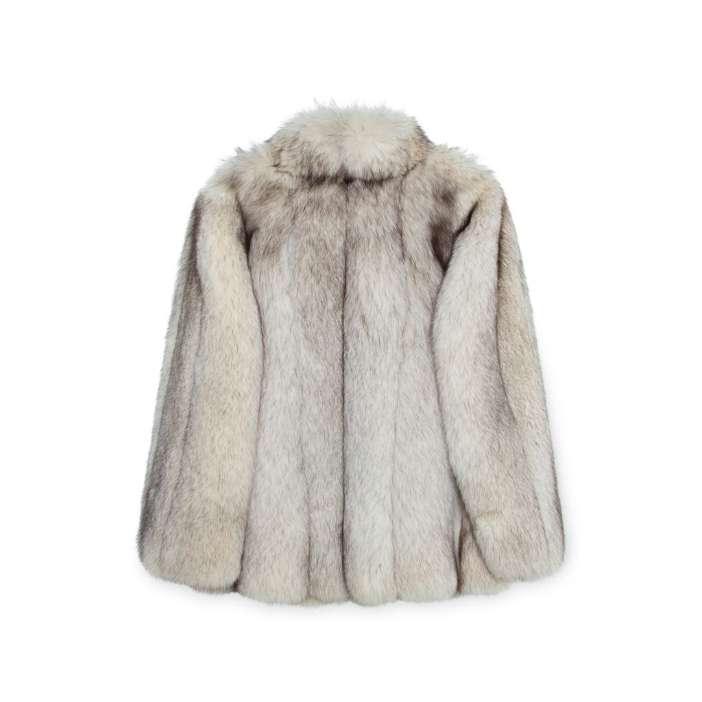 Vintage Hermes fox fur jacket features high collar, two front side pockets, and hook and eye closure at front.