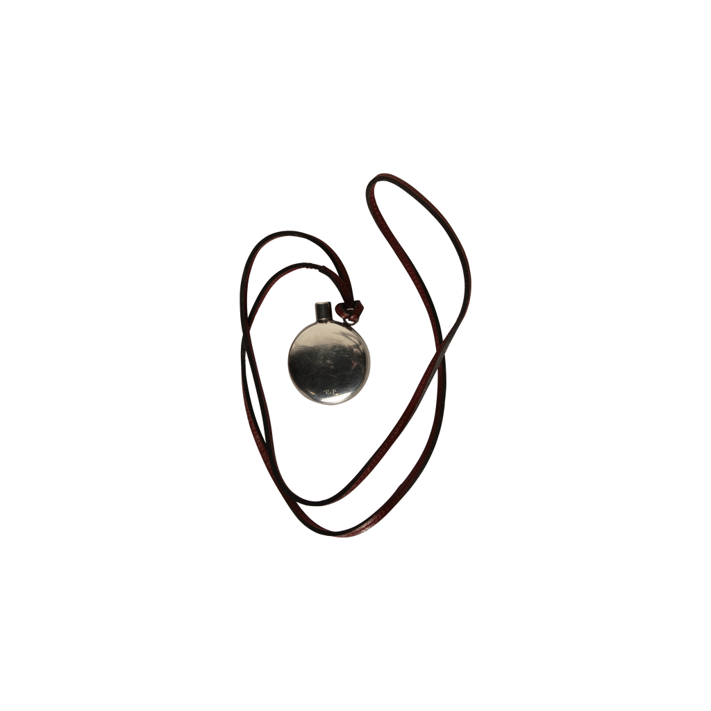 Super rare, sterling silver perfume bottle pendant necklace from Hermès on a gorgeous, burgundy saddle leather cord. The top of the bottle unscrews to reveal a dipper in the cap to apply perfume. This is the only piece like this I have ever seen; it’s very special.