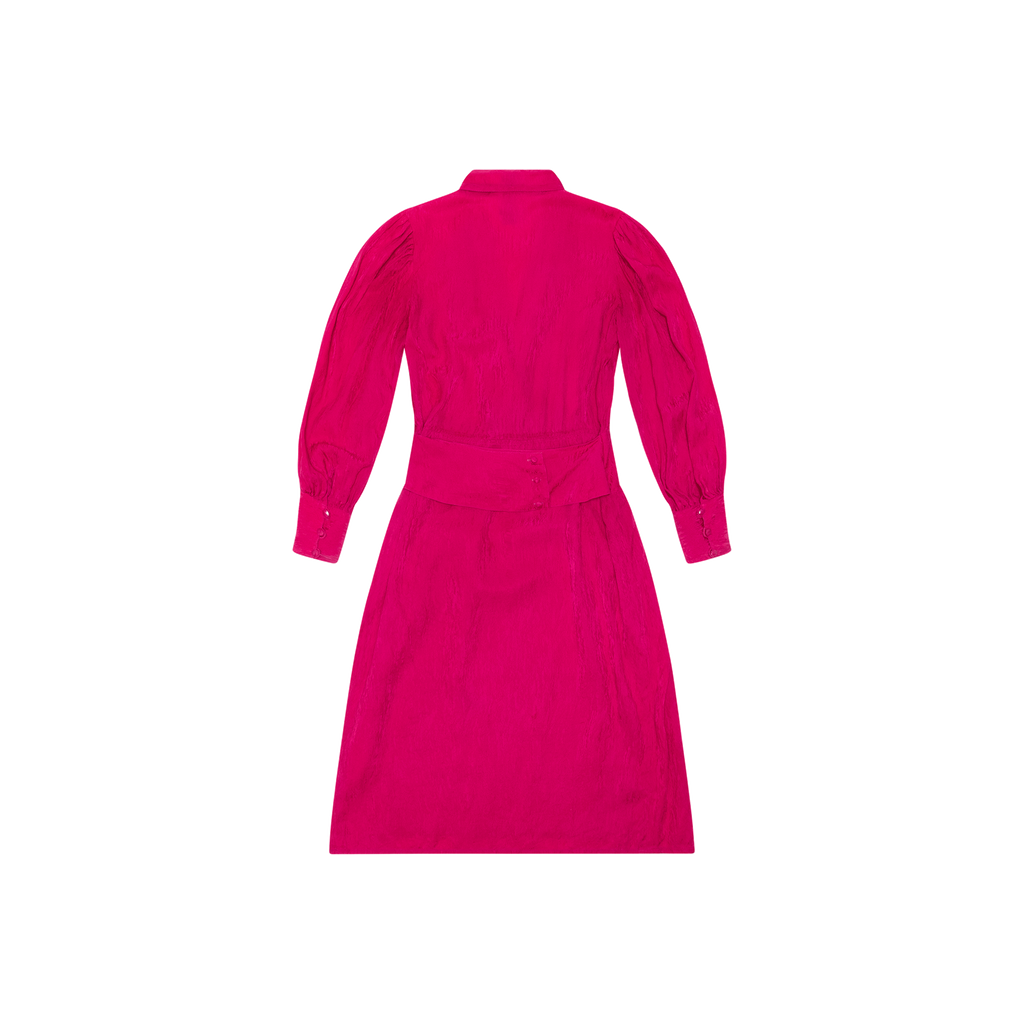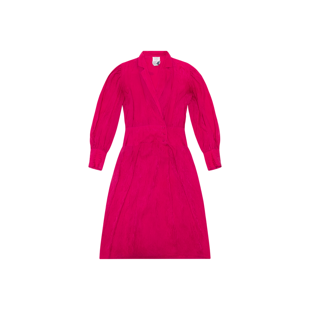 Vintage Hot Pink Midi Dress features V-neck, buttons at waistband, slightly ruched shoulders, and balloon sleeves.