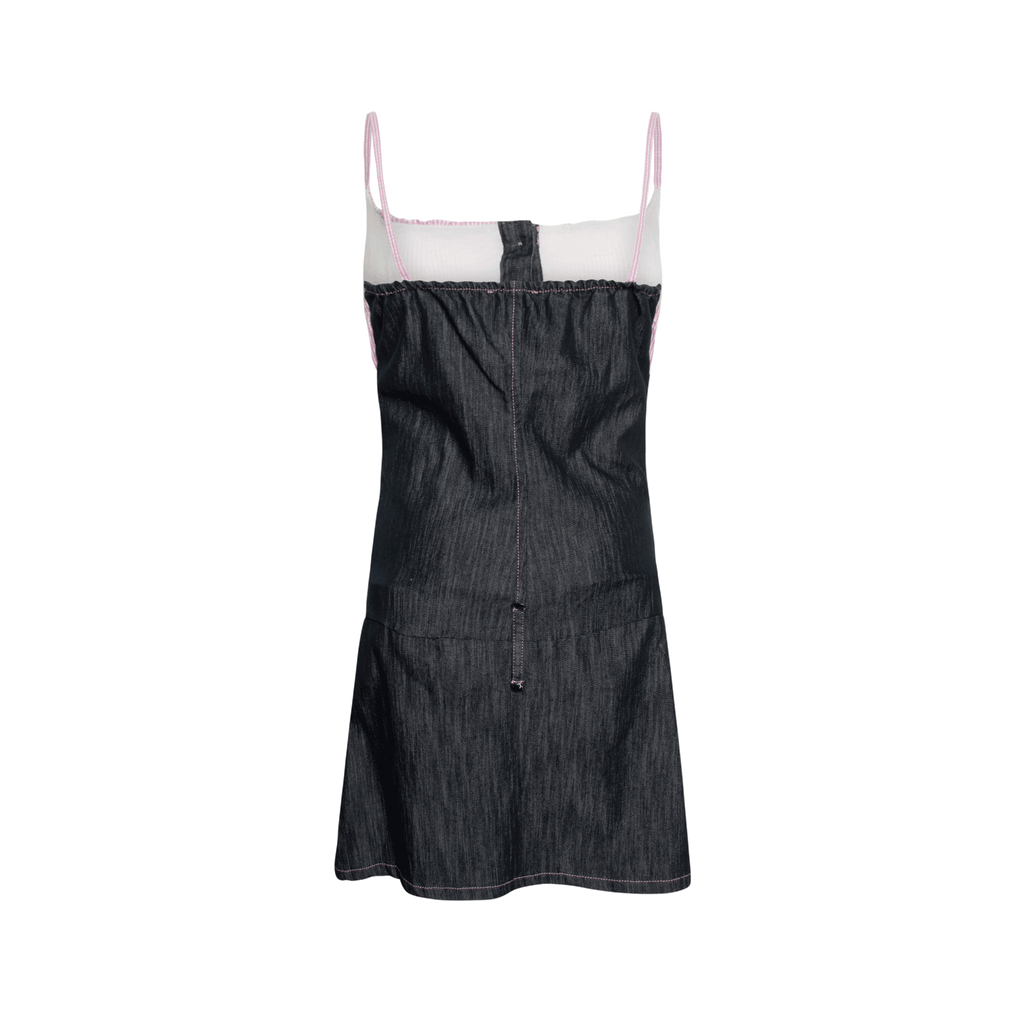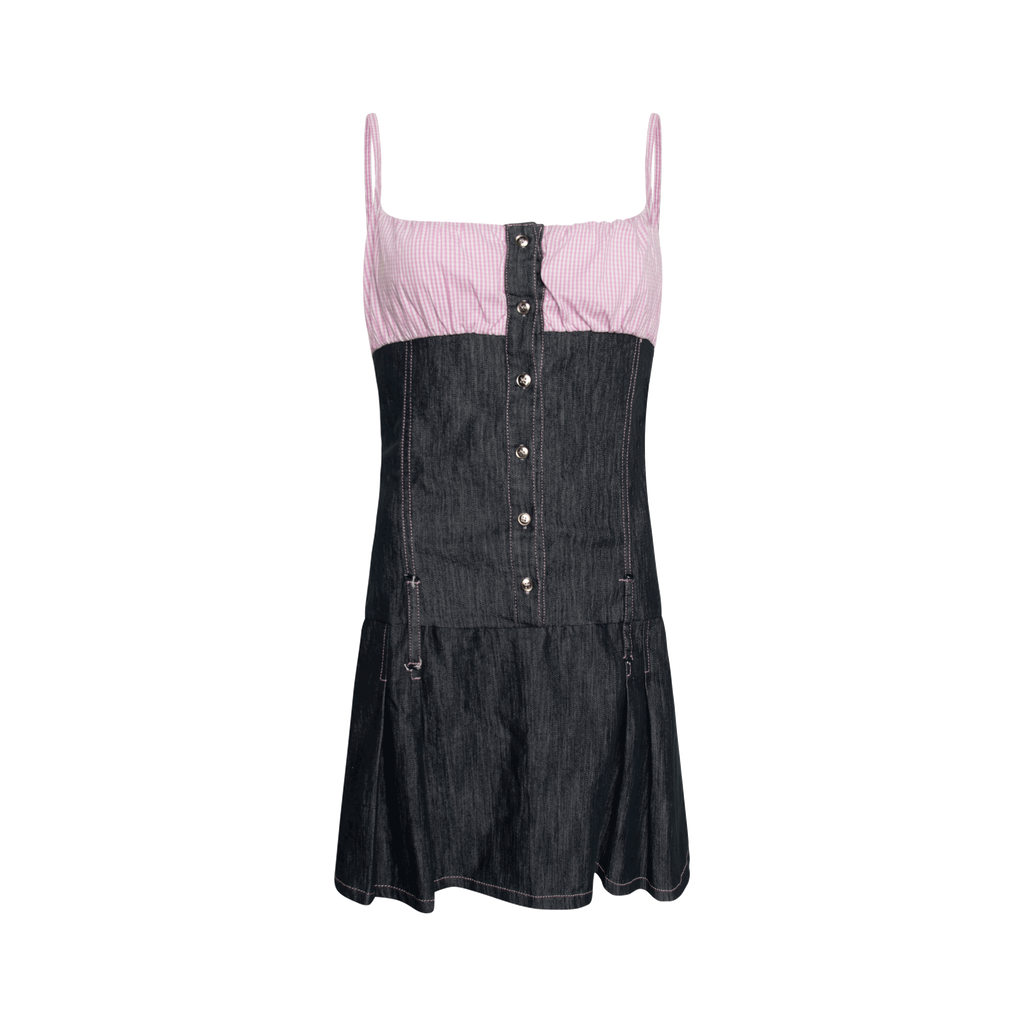Vintage Italian Denim Mini Dress features pink gingham elasticated bust, front button closure, spaghetti straps, belt loops, and drop waist.