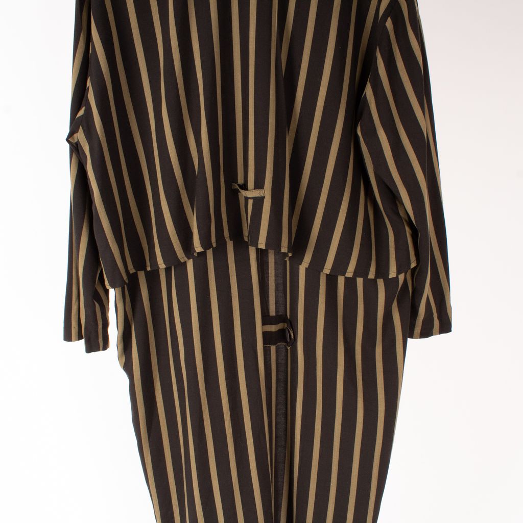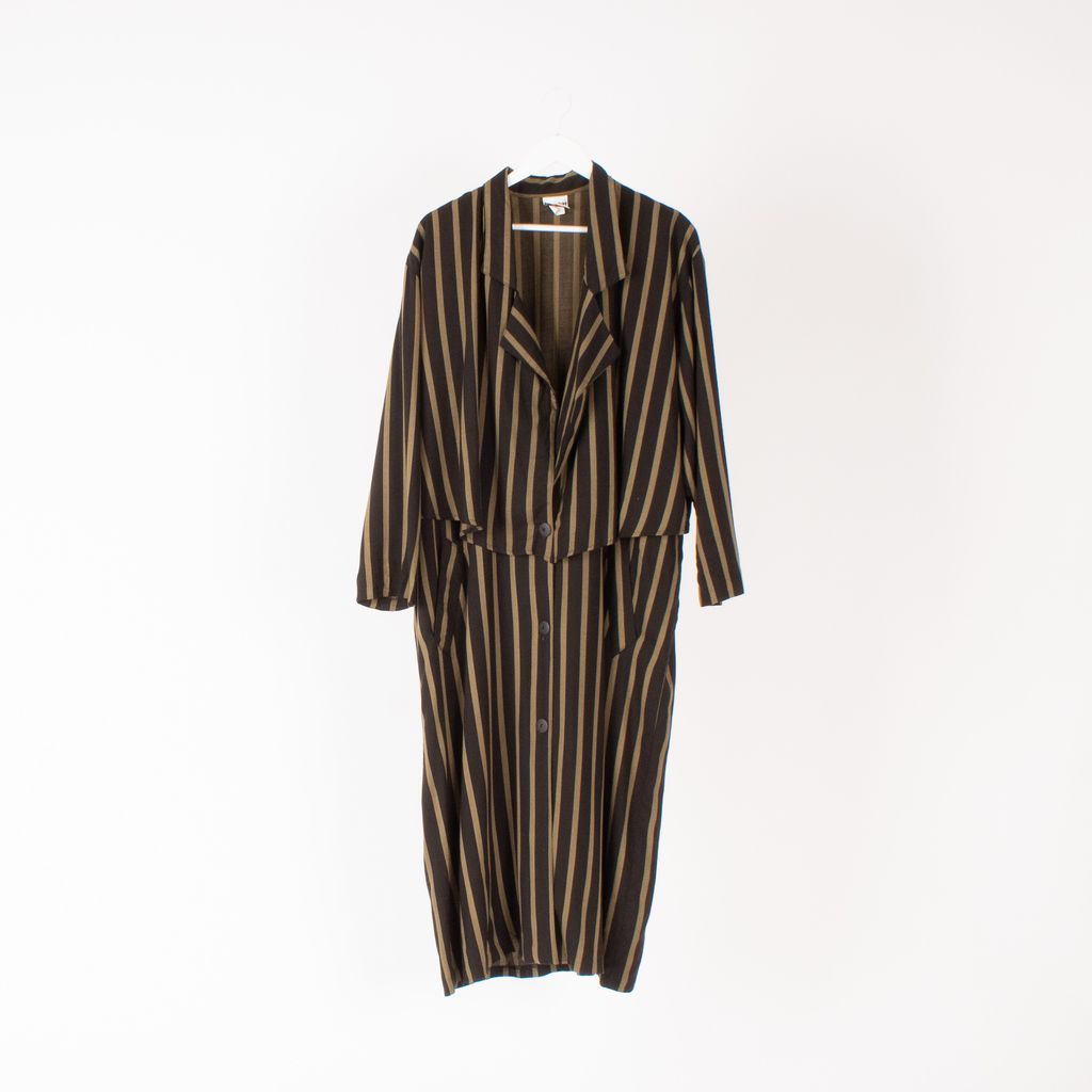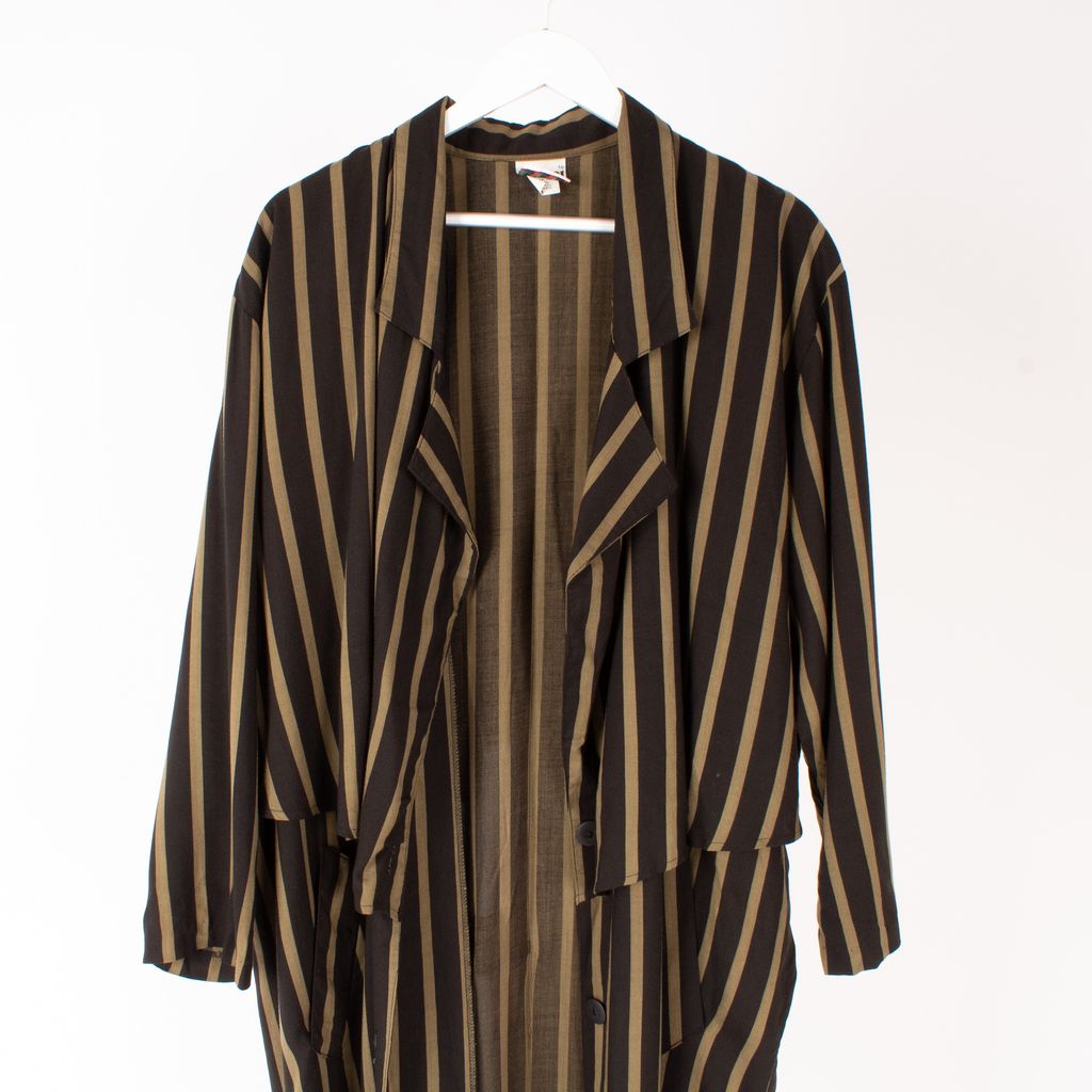 Sleek and chic, this vintage overcoat is a minimalist's dream with its long lines and silhouette. Features wide lapels, button down front closure, top overlay, side front pockets, and open slit back.