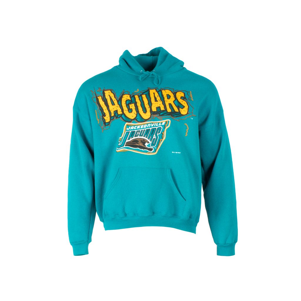 Sporting a 90's era design, this vintage Jacksonville Jaguars hoodie will have you rooting for the home team in style. Features large Jacksonville Jaguars graphic on chest, full hood with tonal pull ties, kangraroo pocket, and rib knit bands at wrists and waist.