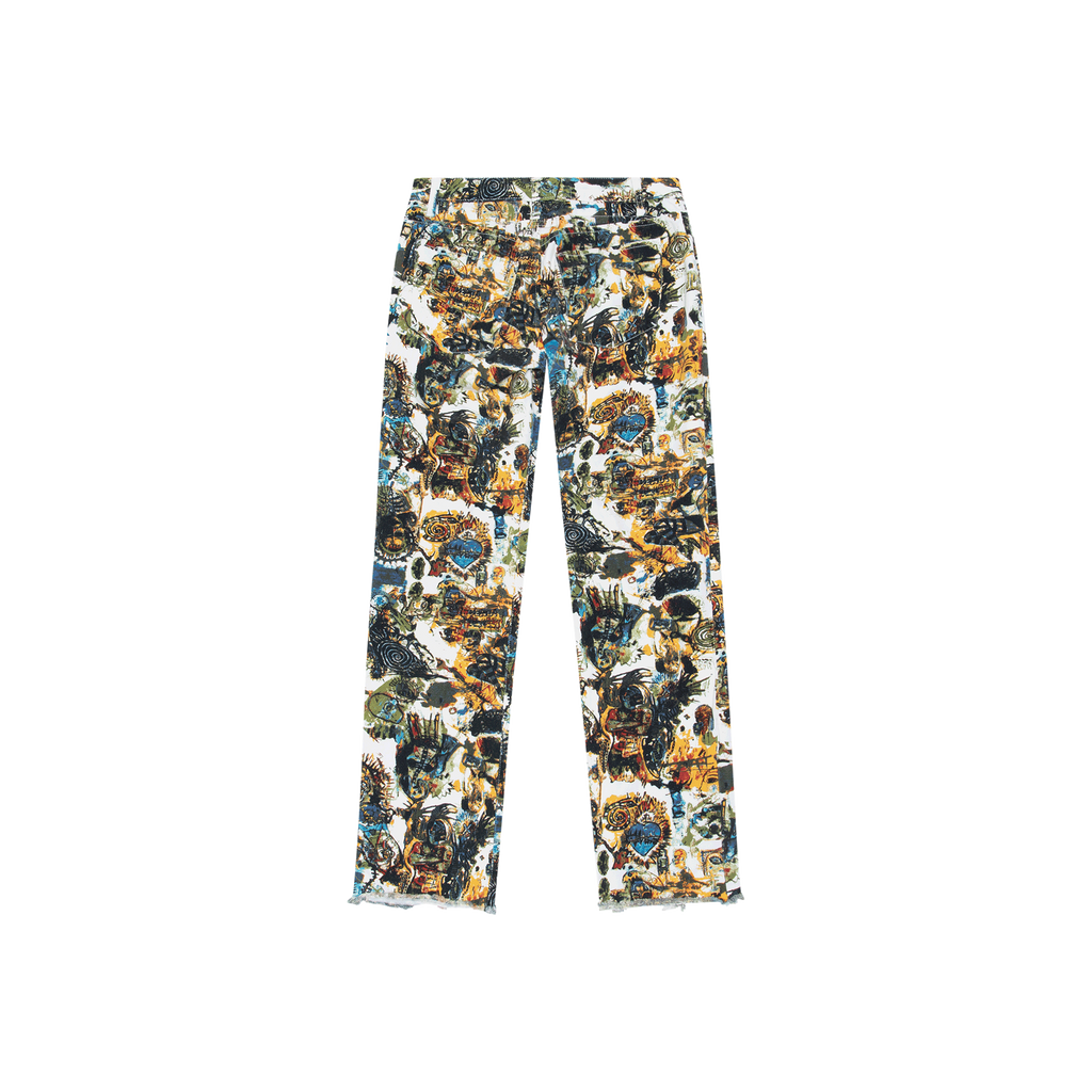 Vintage Jean Paul Gaultier Basquiat Punk Tattoo Jeans features front button closure, 5 pocket styling, low waist, raw hem, and graphic all over.