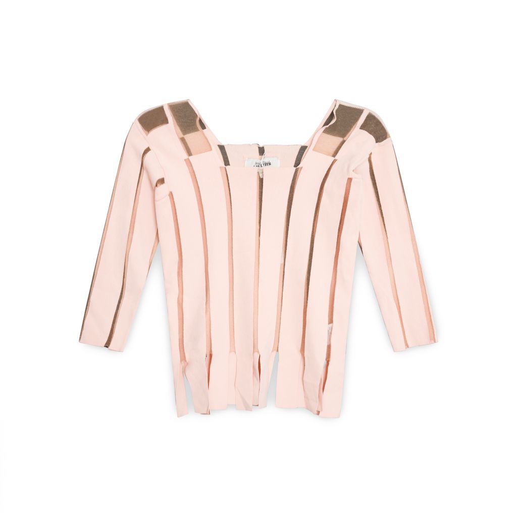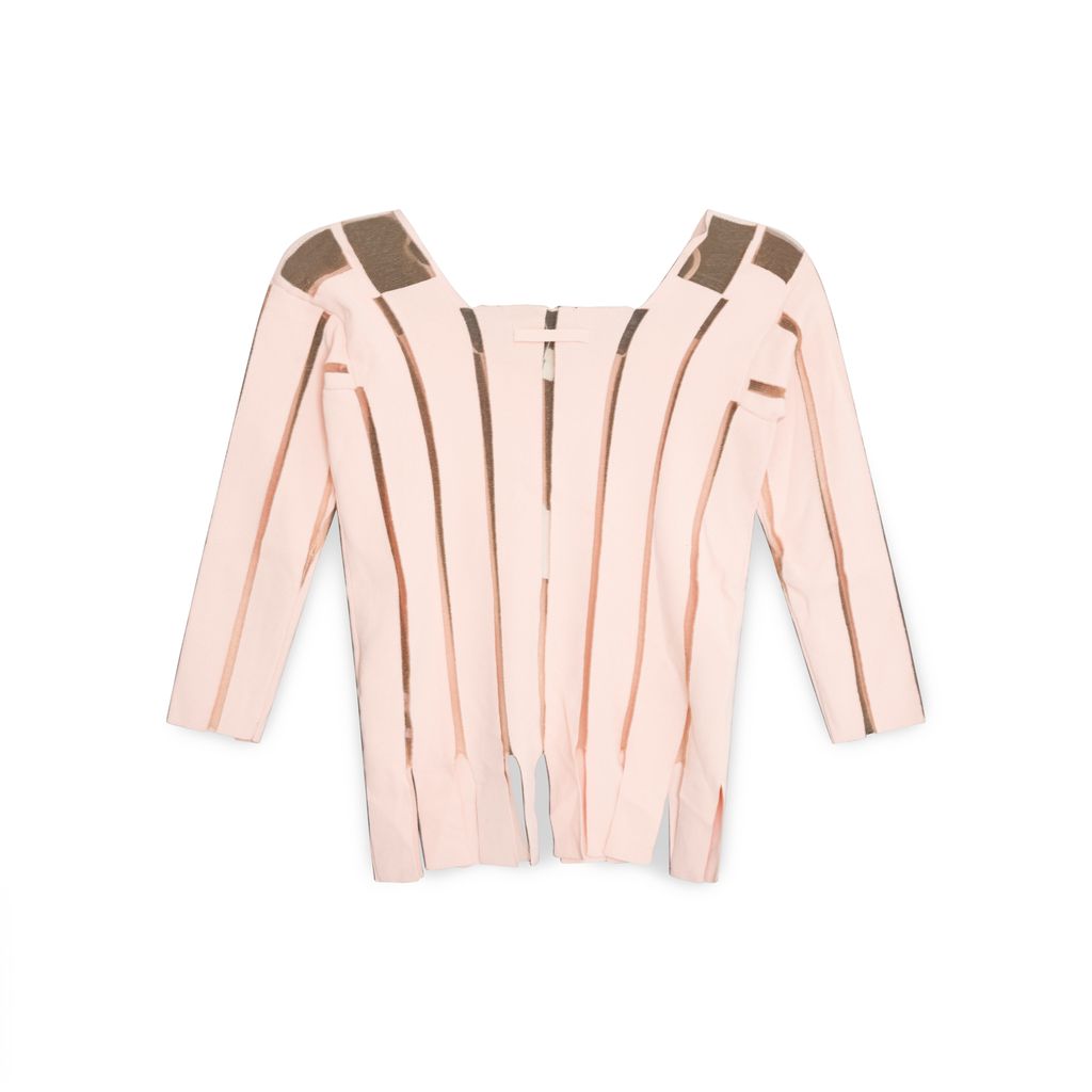 Vintage Jean Paul Gaultier Pink Top features rayon fabric, transparent stripes throughout, scoop collar.