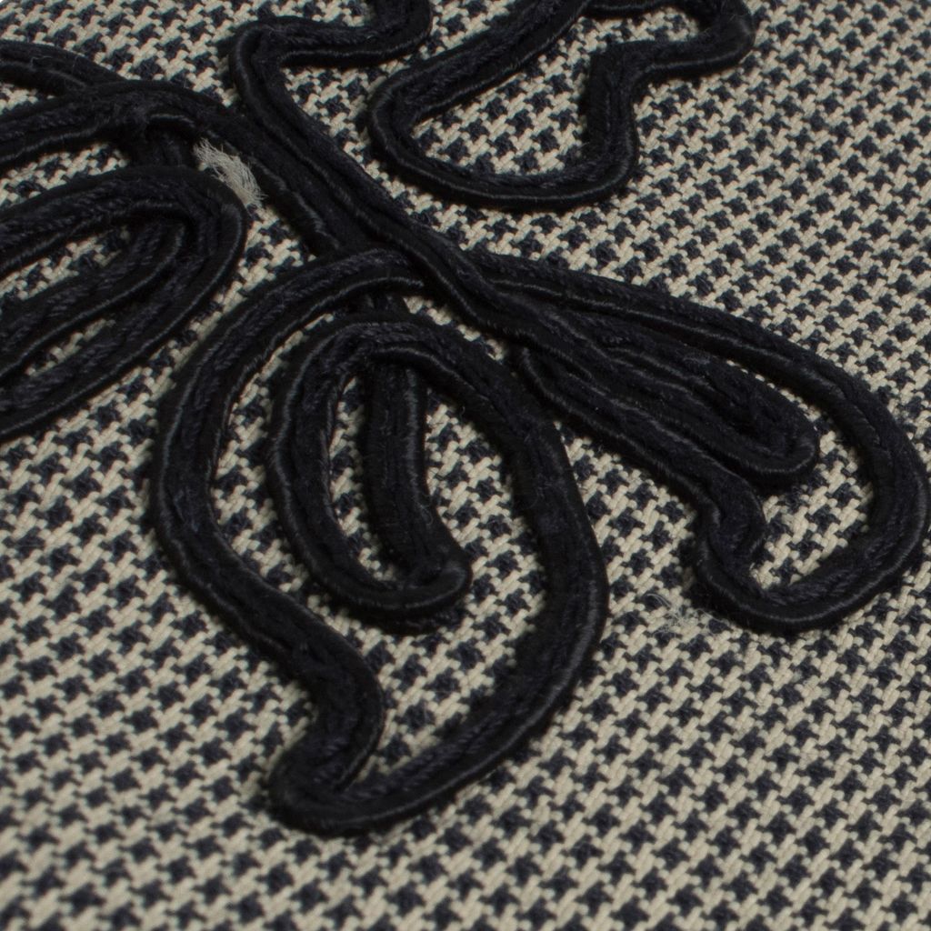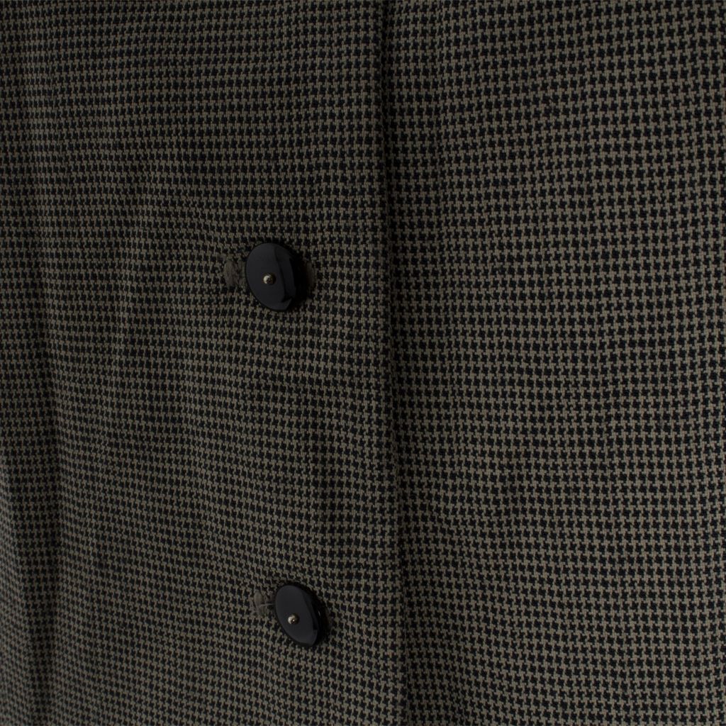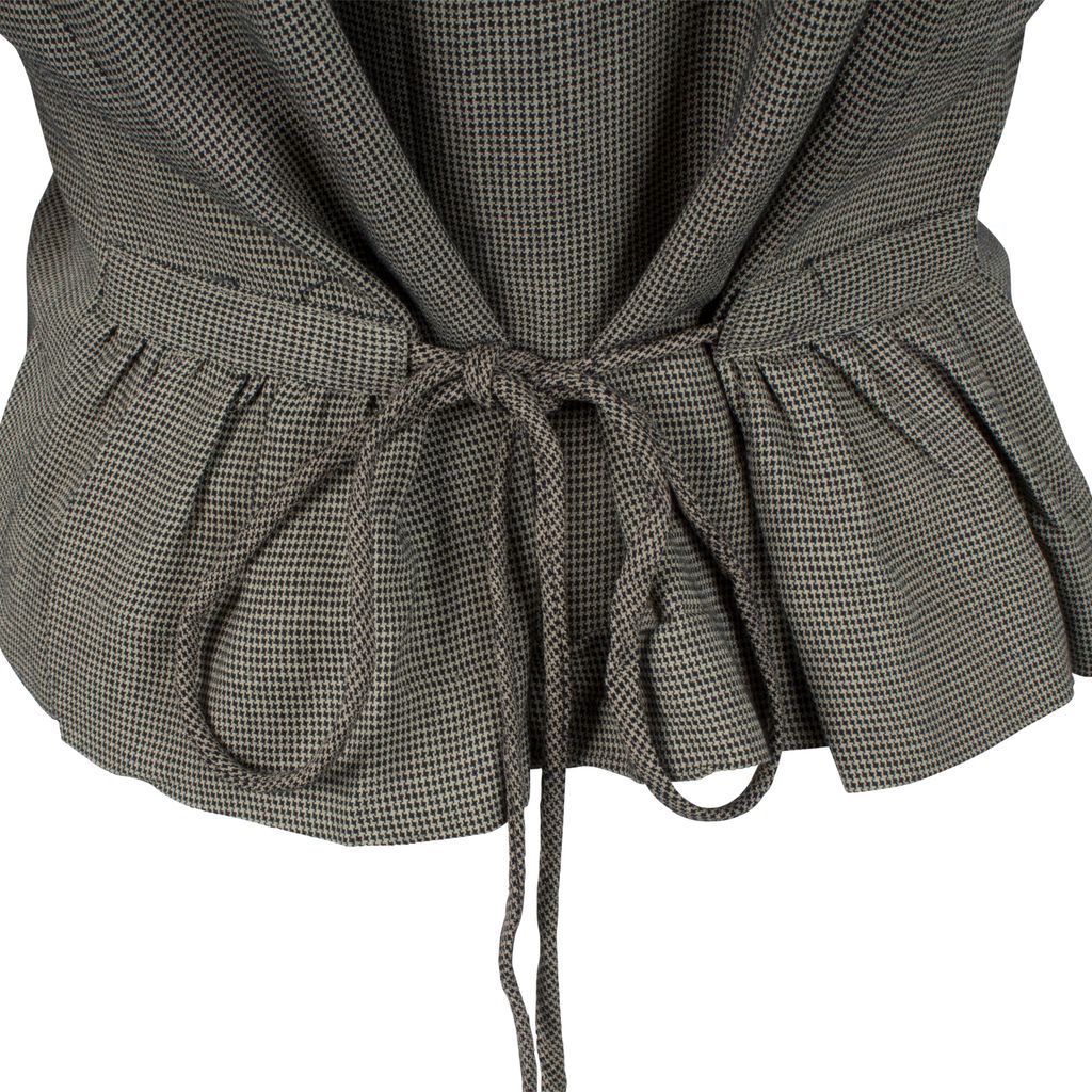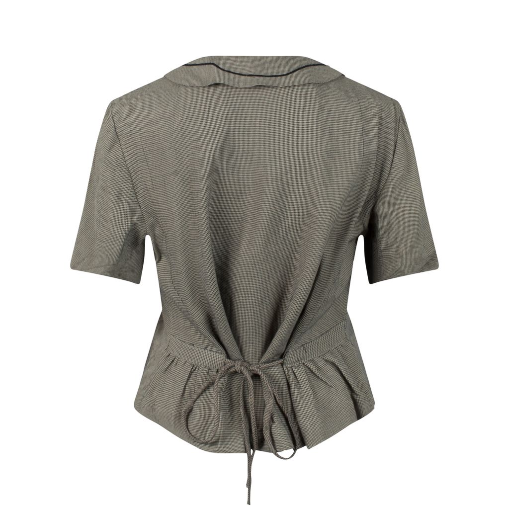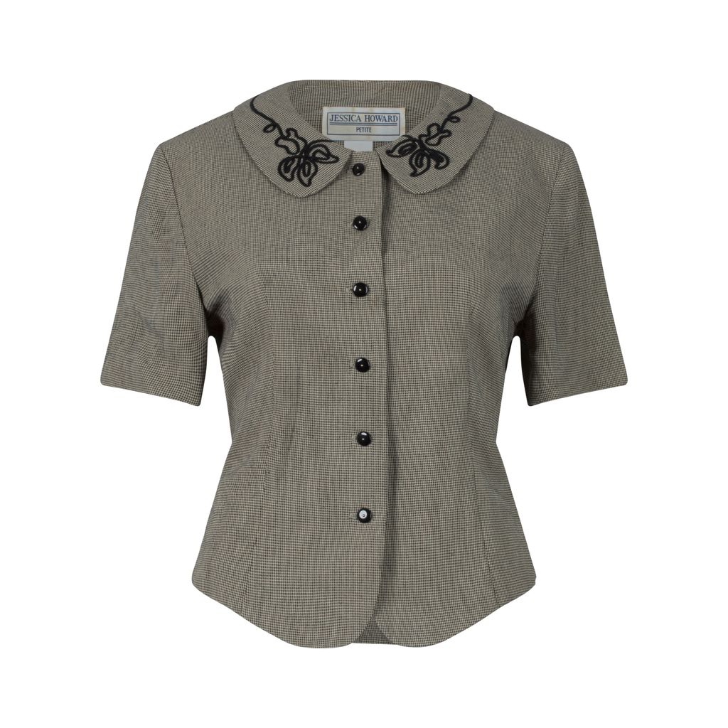 This vintage Jessica Howard top features a button-down front closure, embroidered round collar, and a back self-tie. It is made out of a thick houndstooth print fabric and in excellent condition.