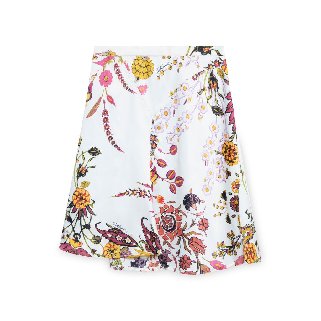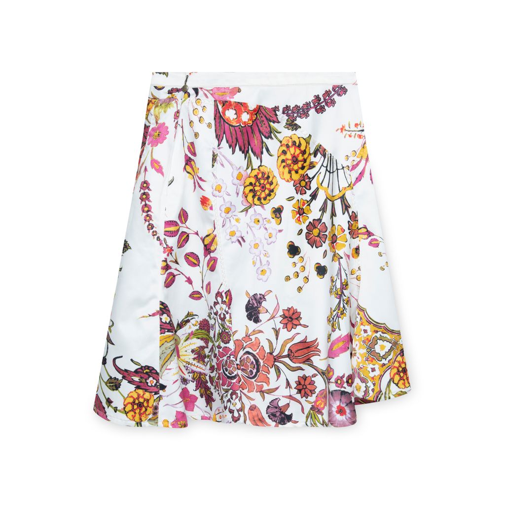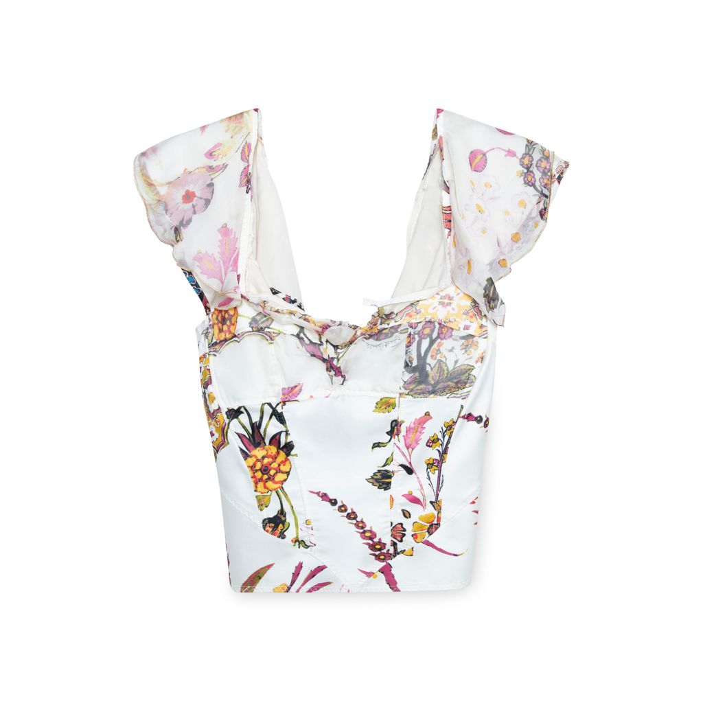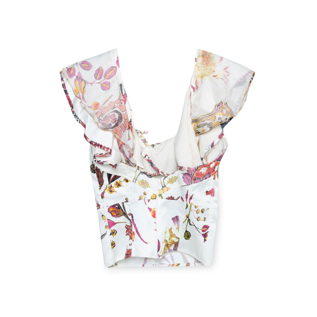 Vintage Just Cavalli Floral Bustier Set features pattern throughout, bustier top with ruffle detail straps, closure zipper at back and flare skirt.