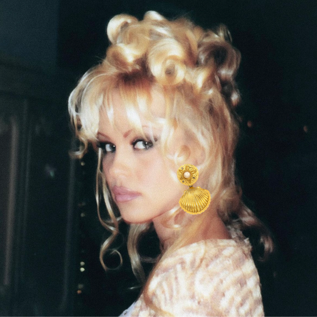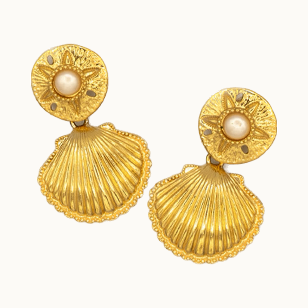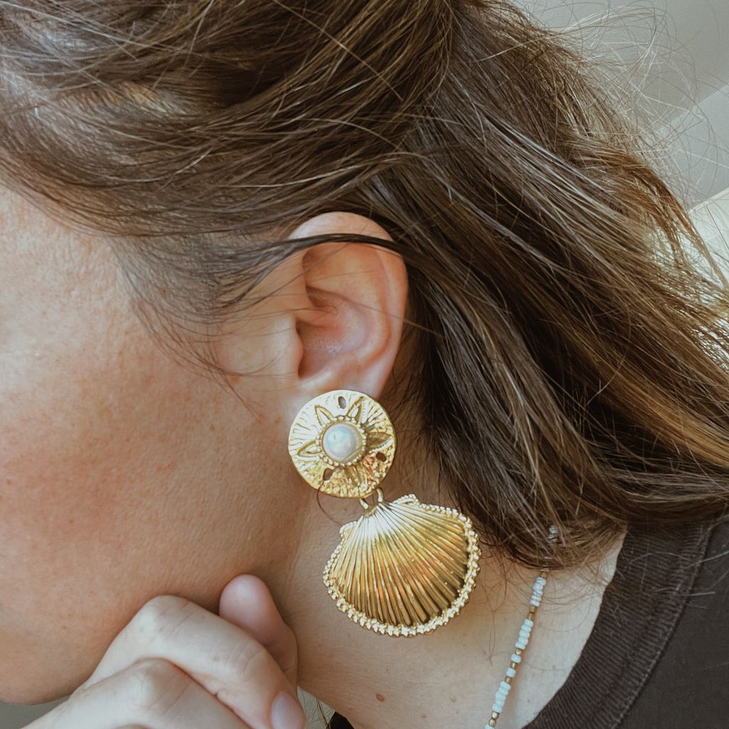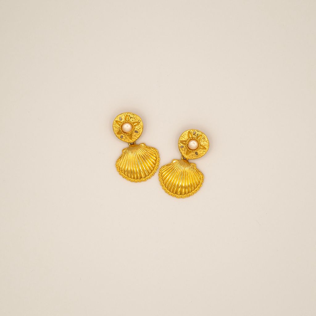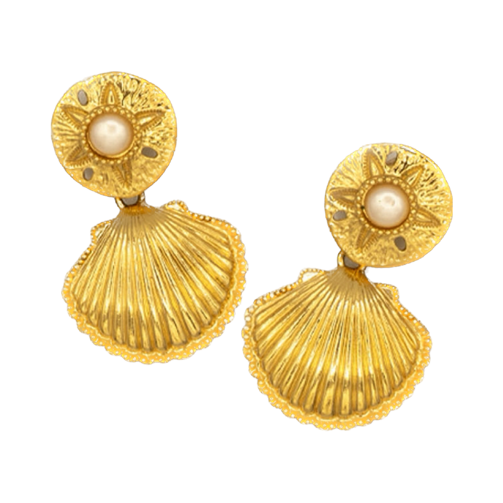 From the Royal Sea Collection, these clip-on earrings from Kenneth Jay Lane for Avon feature a bright gold-tone sand dollar top with a mabe' pearl center, dangling an ornate, domed scallop shell. In excellent condition with secure clip backs, these earrings are a rare find from 1992.
