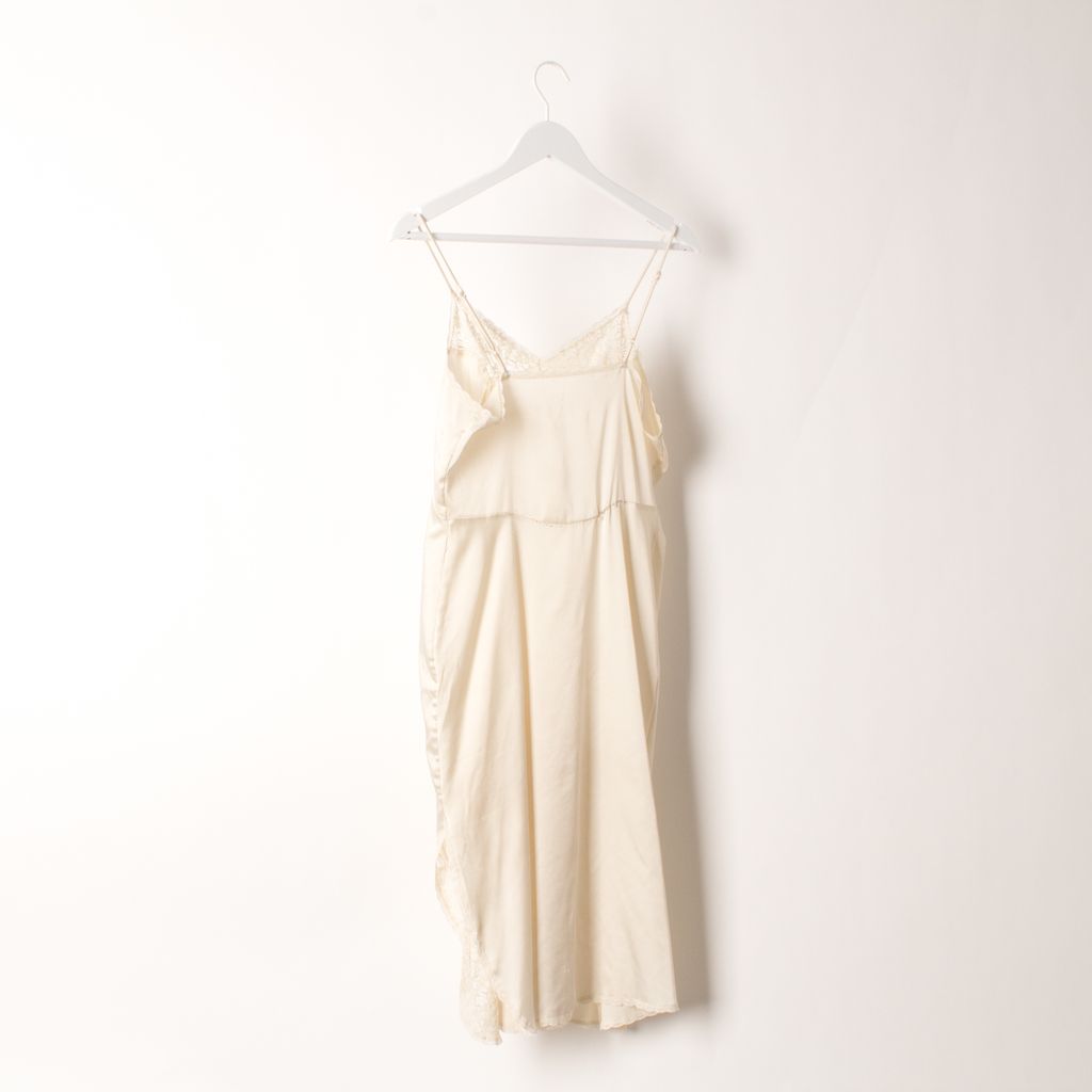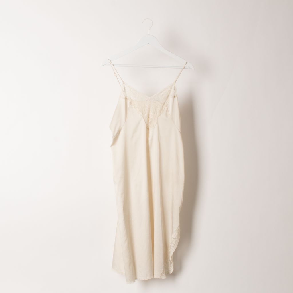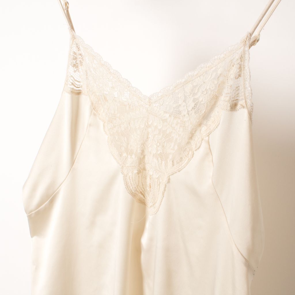 Vintage lightweight lace lined slip, featuring adjustable spaghetti strap fit and a front neckline patterned lace design. Length from top of strap to bottom opening is 39".