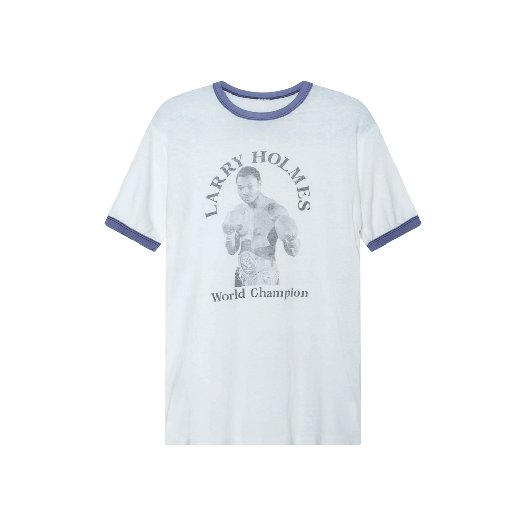 Vintage Larry Holmes Ringer Tee features graphic on front and purple trims.
